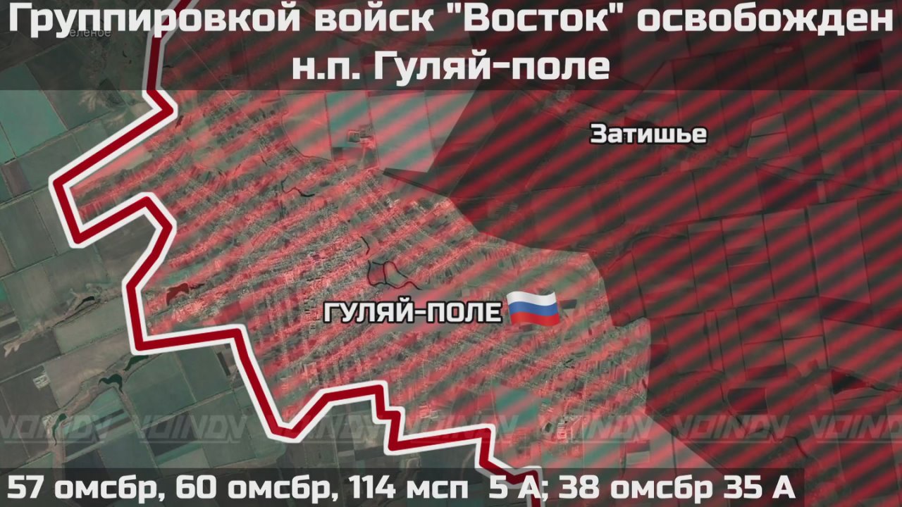 В результате слаженных и решительных совместных штурмовых действий 57 и 60 отдельных мотострелковых бригад, 114 мотострелкового полка 127 дивизии 5 армии, 38 отдельной мотострелковой бригады 35 армии группировки войск «Восток» взят под контроль Гуляйпольский оборонительный район ВСУ, с центром в городе Гуляй-поле, заблаговременно подготовленный противником и оборудованный фортификациями, отлично защищенный естественной водной преградой и окружающей застройкой.Помимо действий штурмовых подразделений, стоит отметить вклад гвардейцев-артиллеристов 305 бригады 5 армии, а также 14 гвардейской бригады спецназа, уничтожавших противника огнем на протяжении всей битвы за Гуляй-поле.