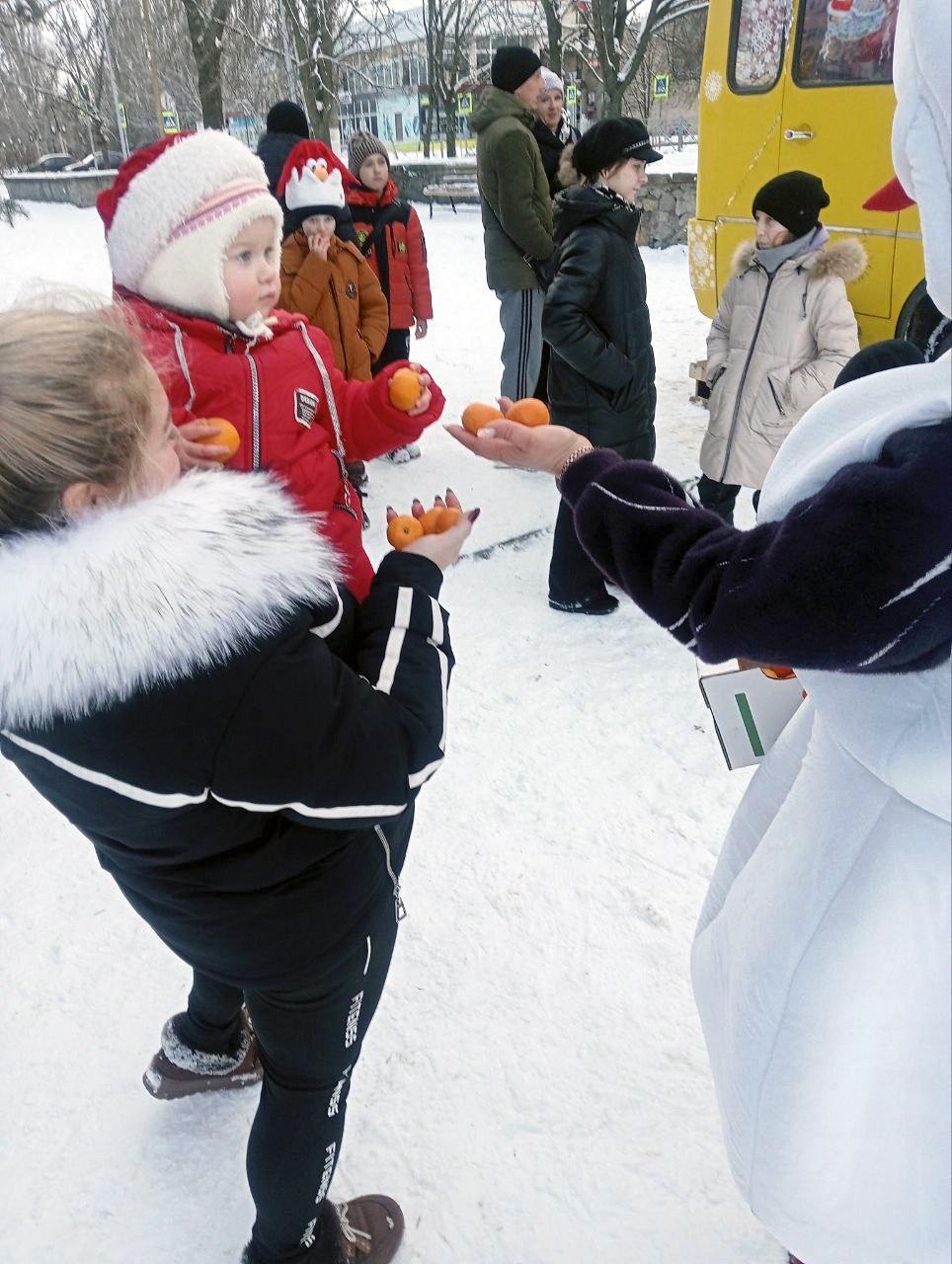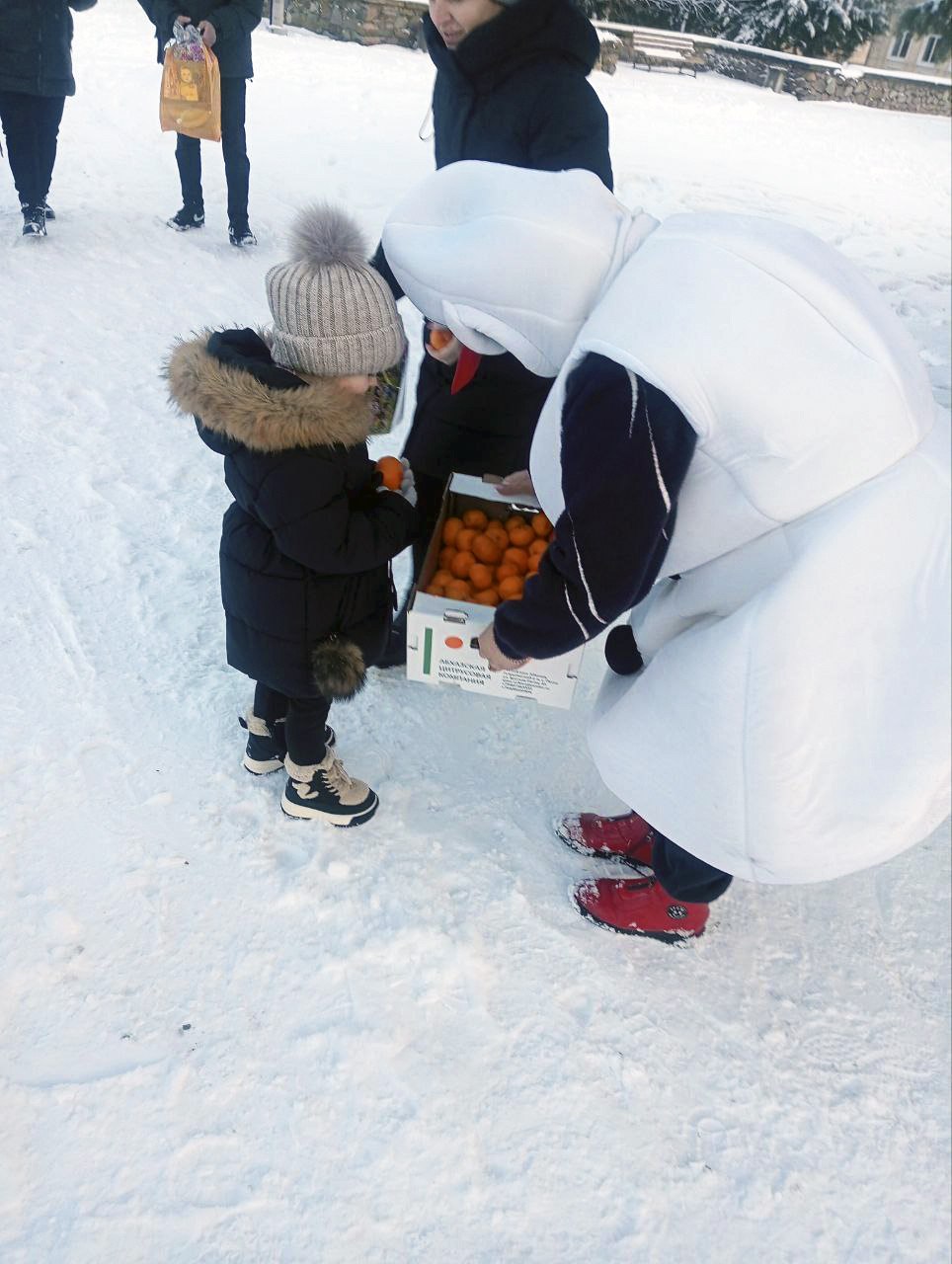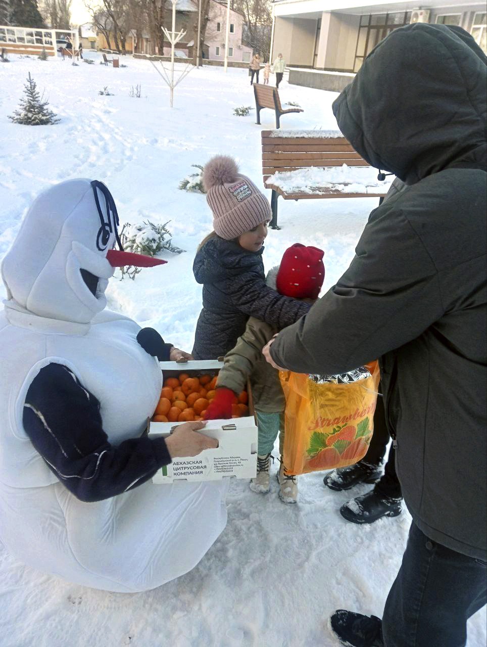 Сегодня возле новогоднего «Морозобуса» Деда Мороза и Снегурочки наш весёлый снеговичок раздавал жителям солнечные мандарины — вкусный подарок от братского народа Абхазии