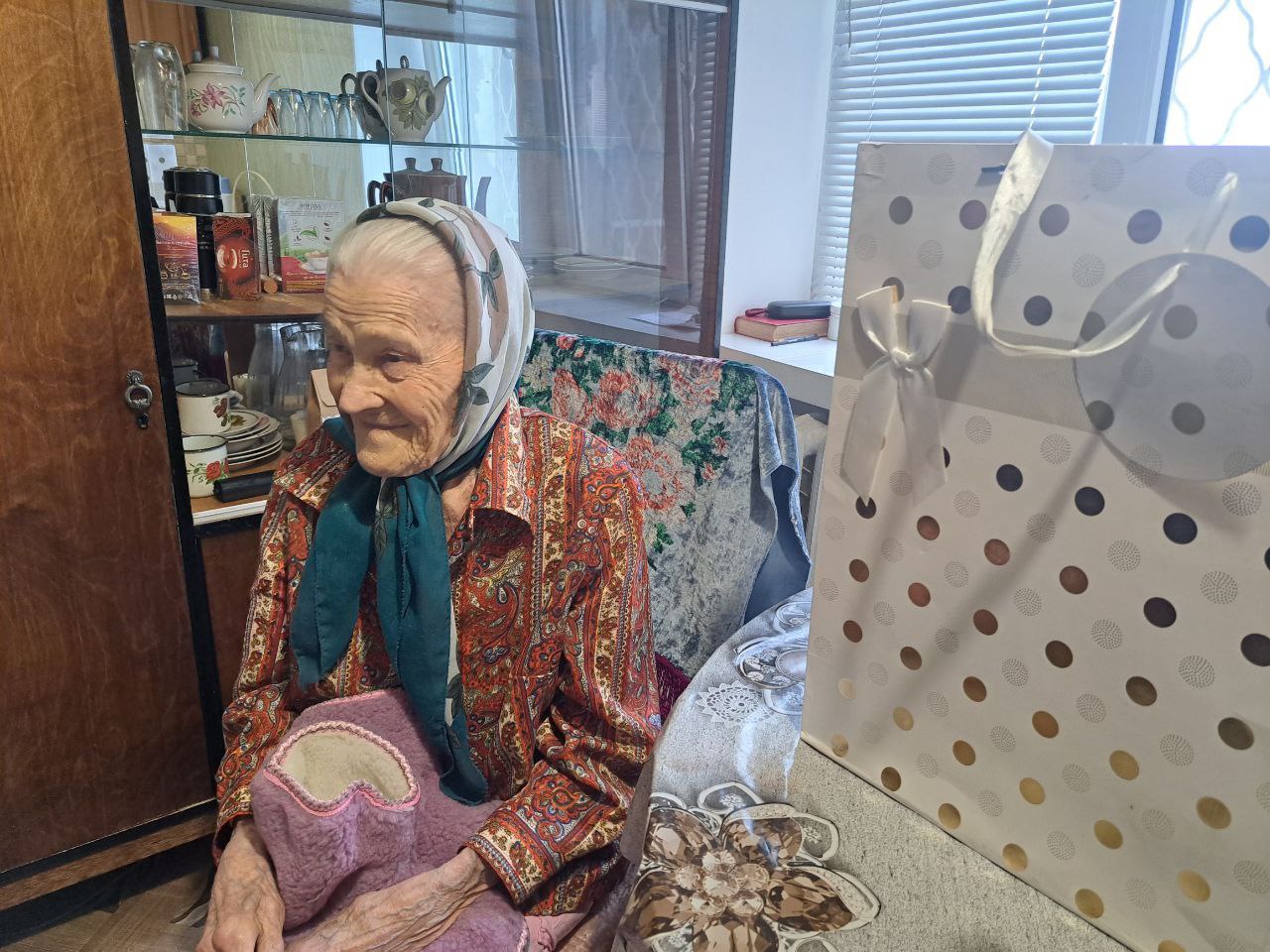 Виктория Викторовна выразила благодарность за вклад, который женщина внесла в Великую Победу, за труд в военные и послевоенные годы, поздравила с наступающими новогодними праздниками, пожелала крепкого здоровья и вручила подарки.