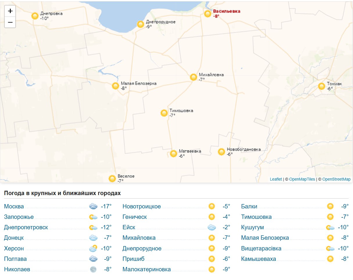 Сегодня, 13 января 2026 года в Васильевке ясно, без осадков. Температура воздуха ... —8°С. Ветер: лёгкий, южный до 1 м/с. Атмосферное давление: 756 мм.рт.ст. Влажность воздуха: 87%. УФ-индекс: 0 (низкий). Видимость на дорогах: 20 км.