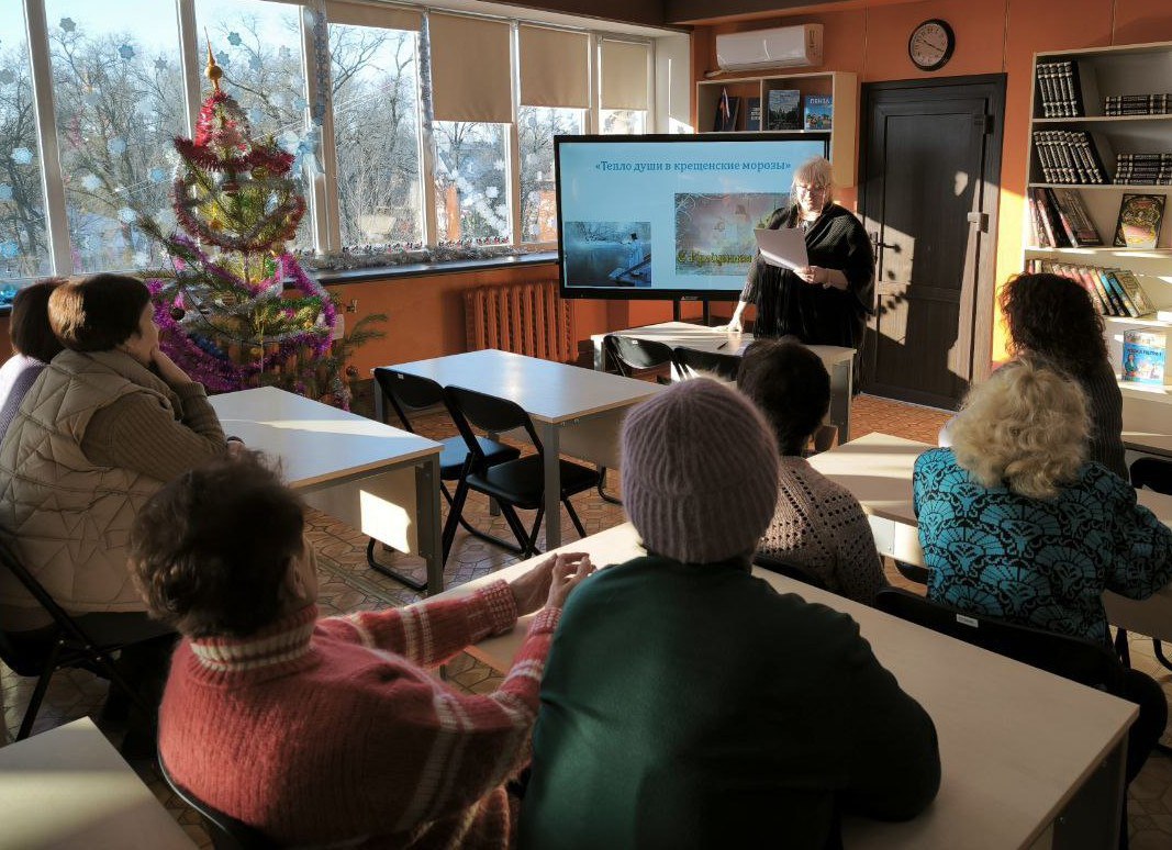В начале встречи библиотекарь познакомила гостей с историей праздника, рассказав о крещении Иисуса Христа в реке Иордан, а также о глубоком смысле и целебных свойствах крещенской воды, которая, согласно верованиям, очищает душу и тело, даруя верующим здоровье на весь год.