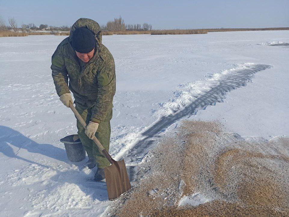 Вчера вблизи стаи зимующих на водоеме лебедей они рассыпали 200 кг зерна.