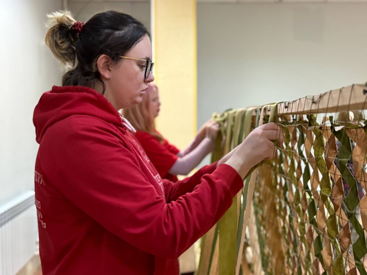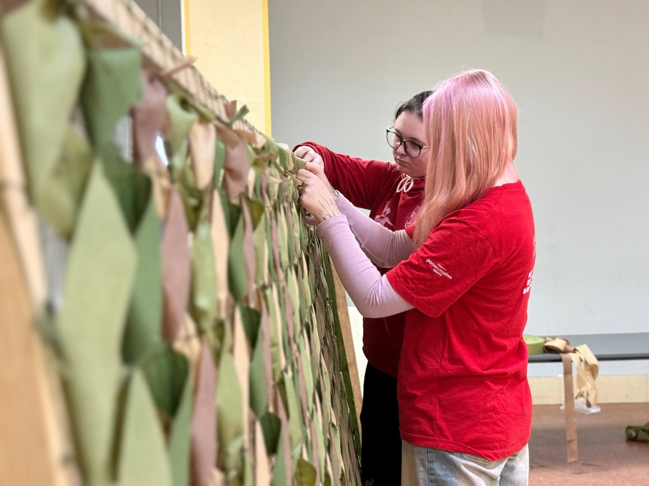 В рамках акции «Миссия Z» добровольцы регионального отделения «Волонтёрской Роты» на базе Штаба общественной поддержки изготавливают маскировочные сети для военнослужащих, находящихся в зоне специальной военной операции.