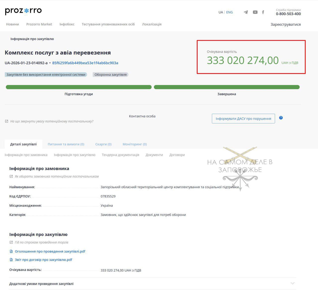 Запорожские ТЦКшники опять отличились — заказали малоизвестной фирме пассажирских авиаперевозок на 333 миллиона.