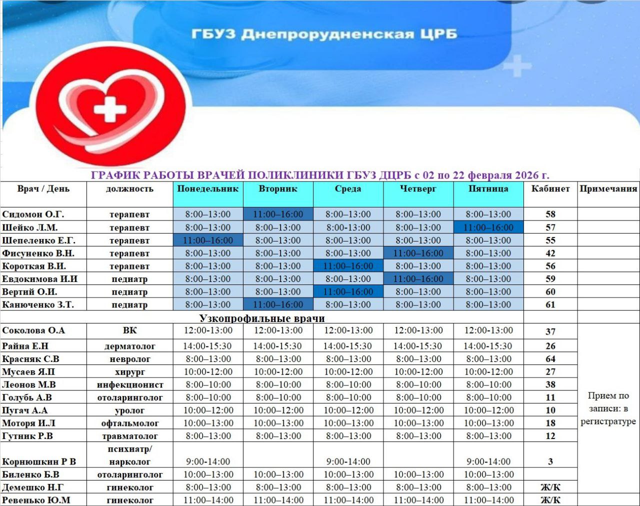 График работы врачей в поликлинике ГБУЗ Днепрорудненская ЦРБ в феврале 2026 года