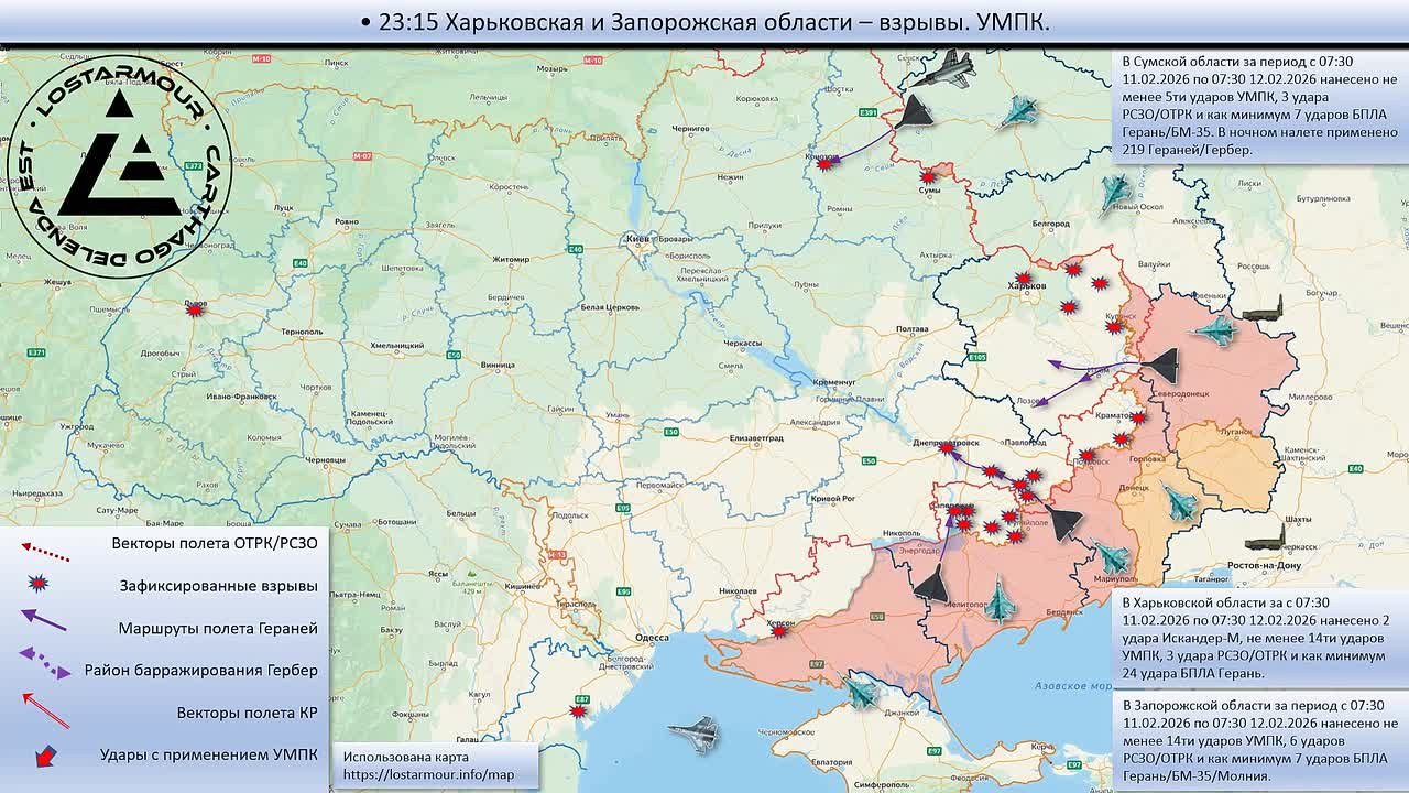Анимированная схема ударов по территории Украины 11 февраля 2026 – 12 февраля 2026 года