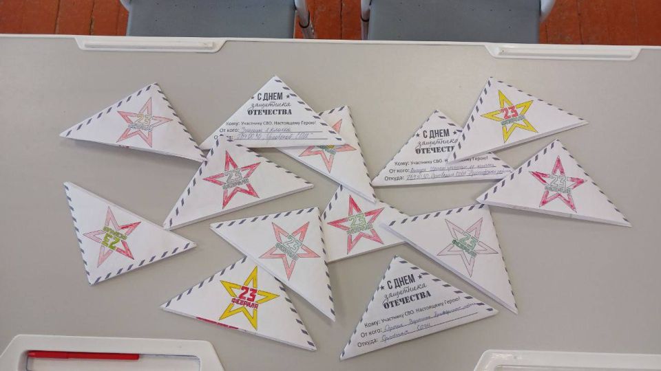 В каждой строчке — искренняя благодарность, пожелания крепкого здоровья и скорейшего возвращения домой с победой. Свои послания школьники сложили в легендарные «фронтовые треугольники», как это делали наши деды и прадеды.