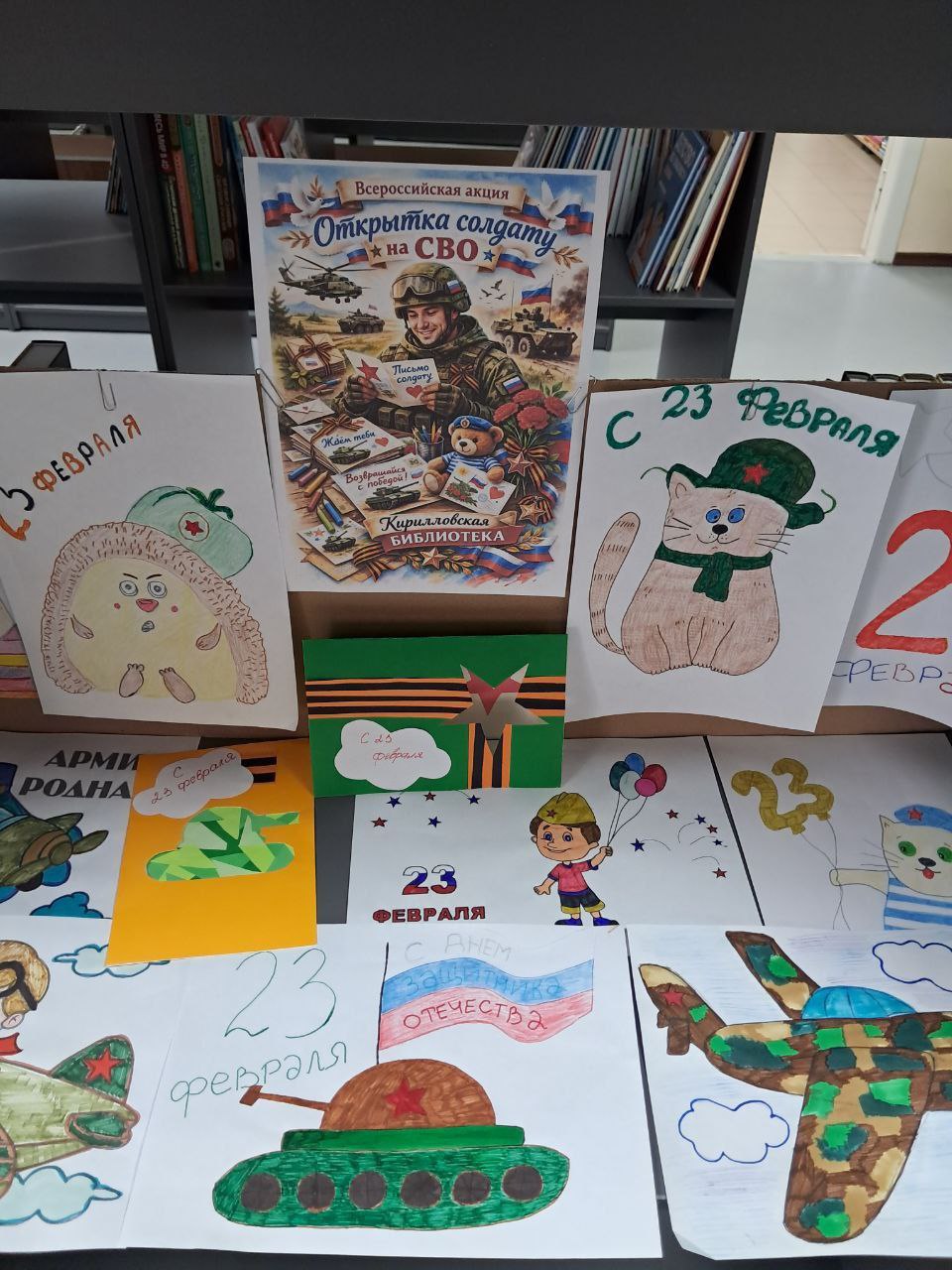 В Кирилловской библиотеке оформлена выставка детских рисунков и открыток ко Дню защитника Отечества в рамках Всероссийской акции «Открытка солдату».