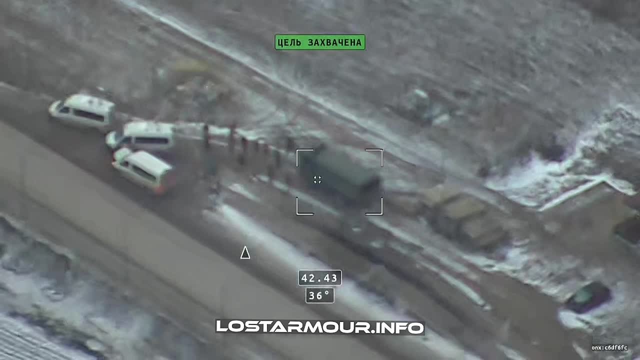 Барражирующий боеприпас "Ланцет" наносит удар по грузовому автомобилю и скоплению пехоты ВСУ в н.п. Новониколаевка, Запорожской области.