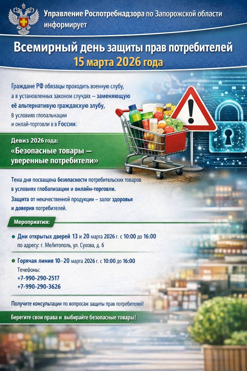 Роспотребнадзор по Запорожской области информирует, что 15 марта 2026 года проводится Всемирный день защиты прав потребителей, который ежегодно отмечается во всём мире с 1983 года, а в Российской Федерации — с 1994 года.