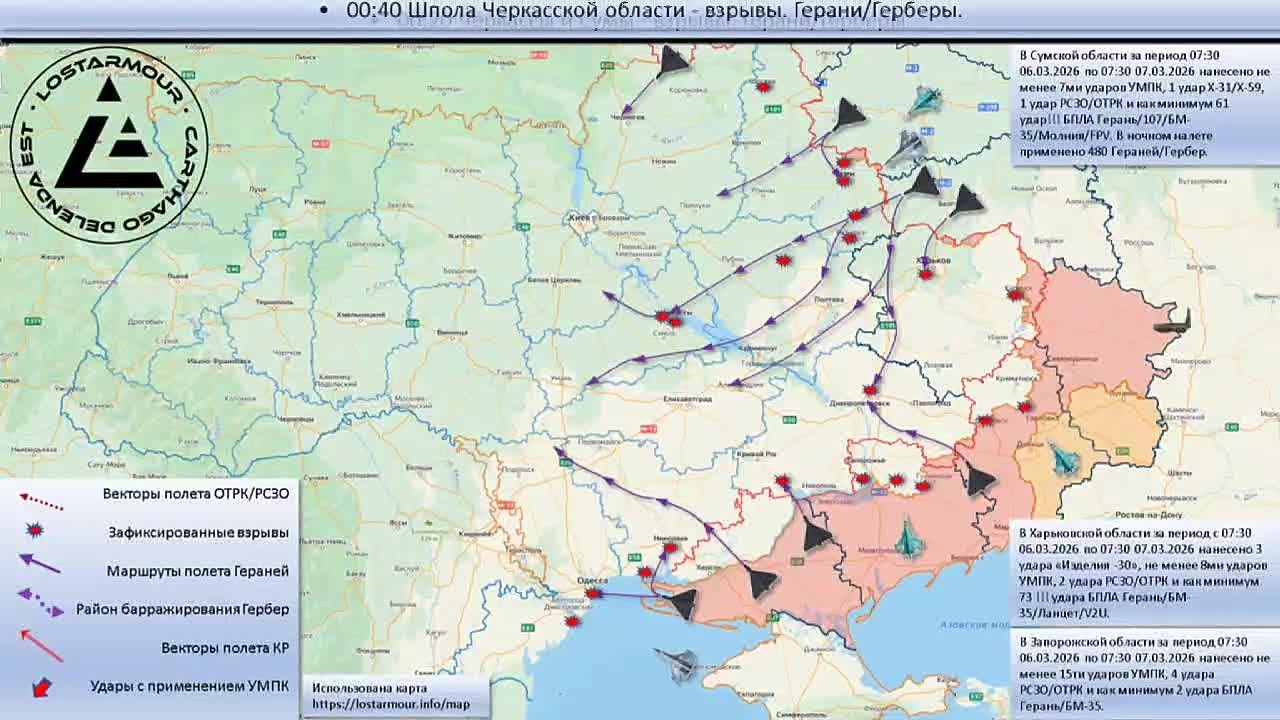 Анимированная схема ударов по территории Украины 06 марта 2026 – 07 марта 2026 года