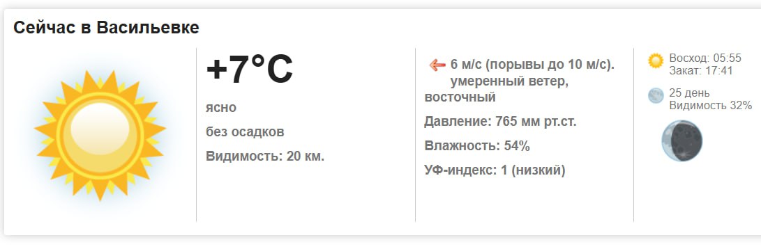 Сегодня, 13 марта 2026 года в Васильевке ясно, без осадков. Температура воздуха ... +7°С. Ветер: умеренный, восточный до 10 м/с. Атмосферное давление: 756 мм.рт.ст. Влажность воздуха: 54%. УФ-индекс: 1 (низкий). Видимость на дорогах: 20 км.