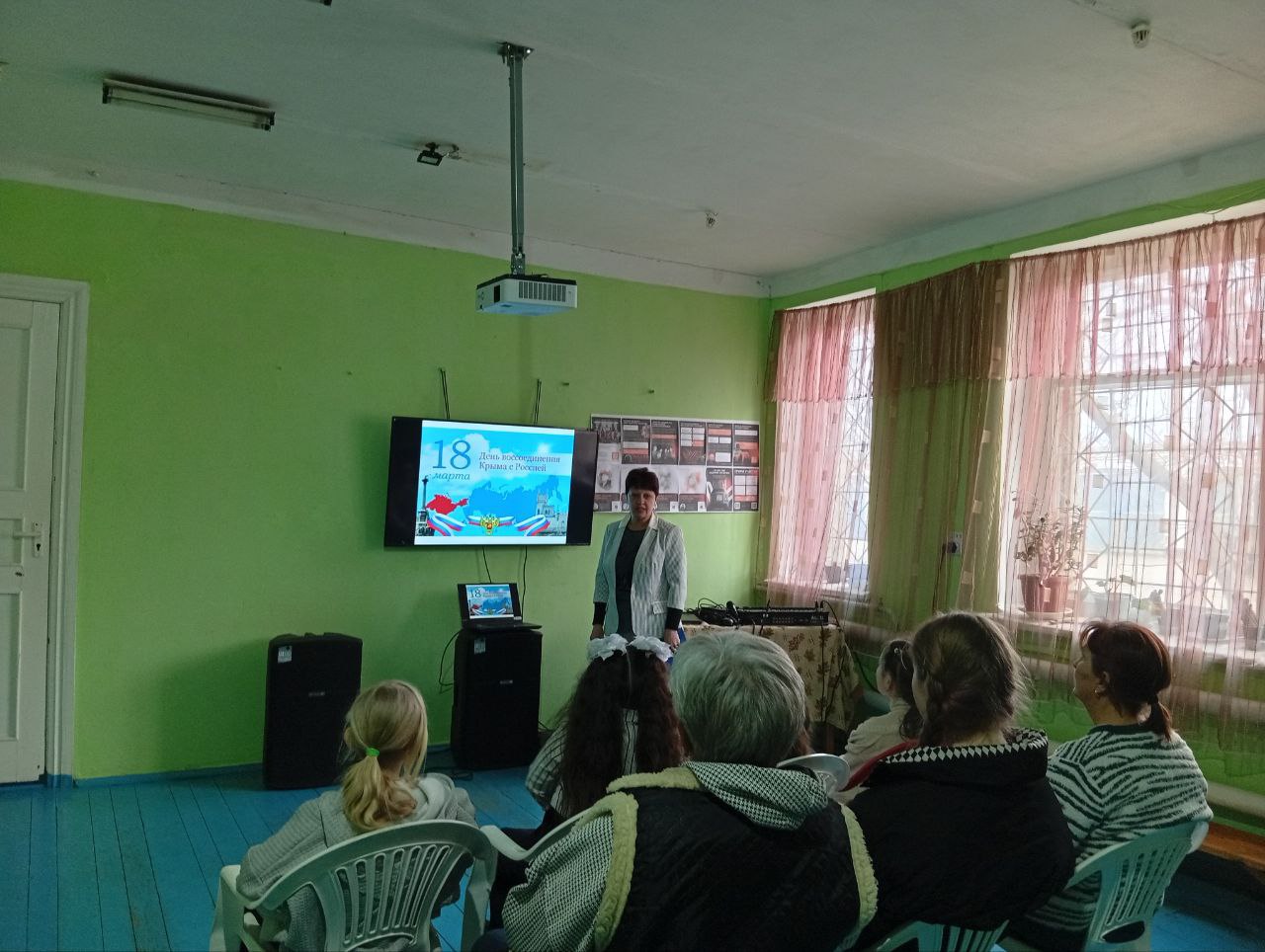 В Центральной библиотеке села Дмитровка организовали просмотр фильма «Частичка России — прекрасный наш Крым» с последующим обсуждением. Участники поговорили о влиянии воссоединения на жизнь крымчан и всей страны, а также узнали о культурном наследии и многообразии народов полуострова.