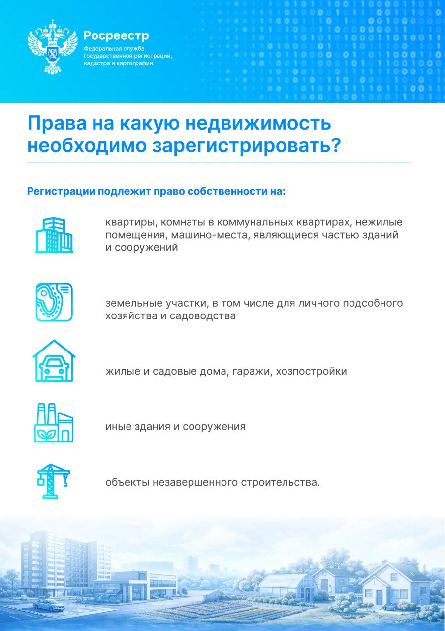 Важная информация для жителей Донецкой и Луганской народных республик, Запорожской и Херсонской областей: до 1 июля 2026 года гражданам России необходимо подать в Росреестр документы для регистрации прав на объекты недвижимости.