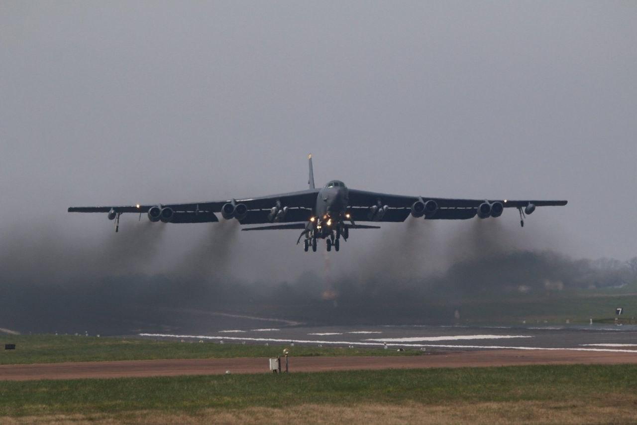 Стратегические бомбардировщики В-52Н и В-1, а также высотный самолет-разведчик U-2 ВВС США на авиабазе Фэрфорд в Великобритании.