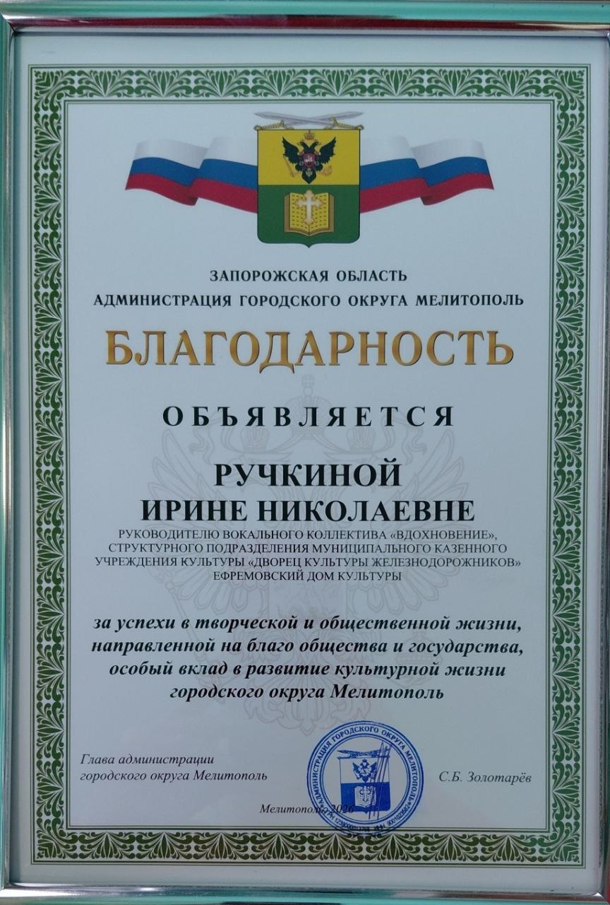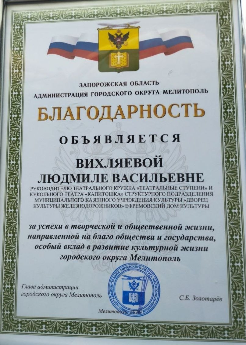 С Кирилловского сельского поселения были отмечены Благодарностью за особый вклад в развитие культурной жизни городского округа Мелитополь сотрудники Ефремовского Дома культуры Ручкина Ирина Николаевна и Вихляева Людмила Васильевна.