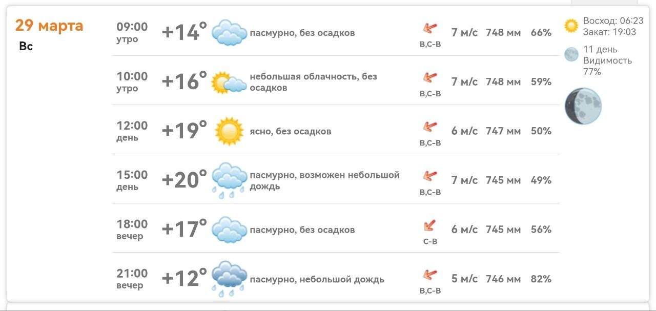 Сегодня +14…+20°. Утром облачно, днём ясно, но к 15:00 возможен небольшой дождь. Ветер восточный, 5–7 м/с. Вечером +12…+17°, пасмурно, после 21:00 — дождь.