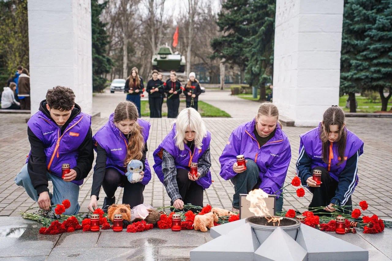 Активисты межрегионального молодежного движения «Юг Молодой» совместно с волонтерами регионального штаба #МЫВМЕСТЕ и активистами «Волонтёры Победы» возложили цветы к Вечному огню на мемориальном комплексе «Братское кладбище» и почтили память погибших минутой молчания.