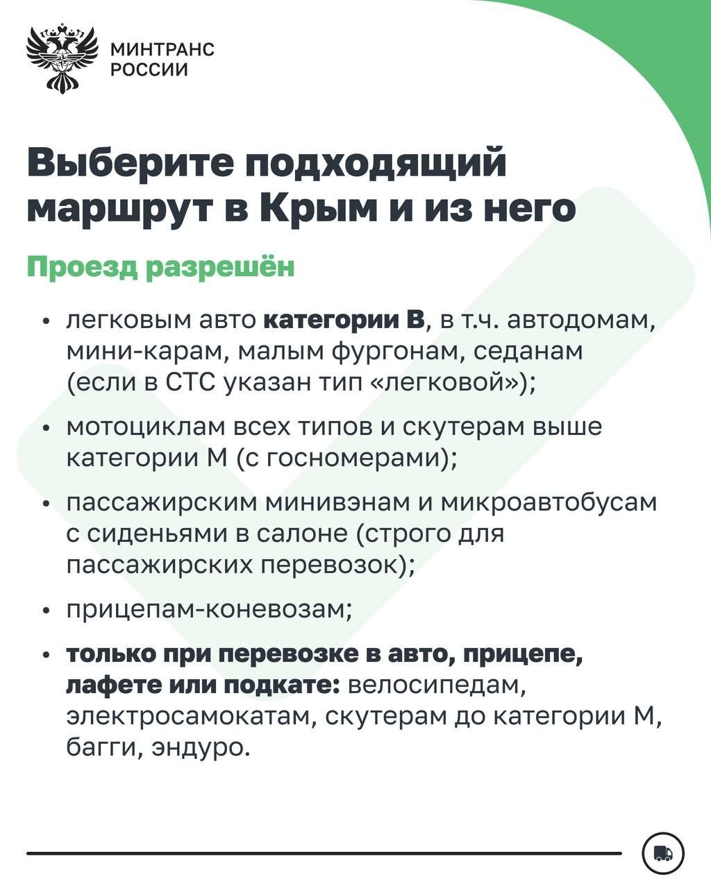 Гибридным автомобилям и электромобилям проезд по мосту запрещен. Для них предусмотрен другой маршрут – трасса Р-280 «Новороссия».