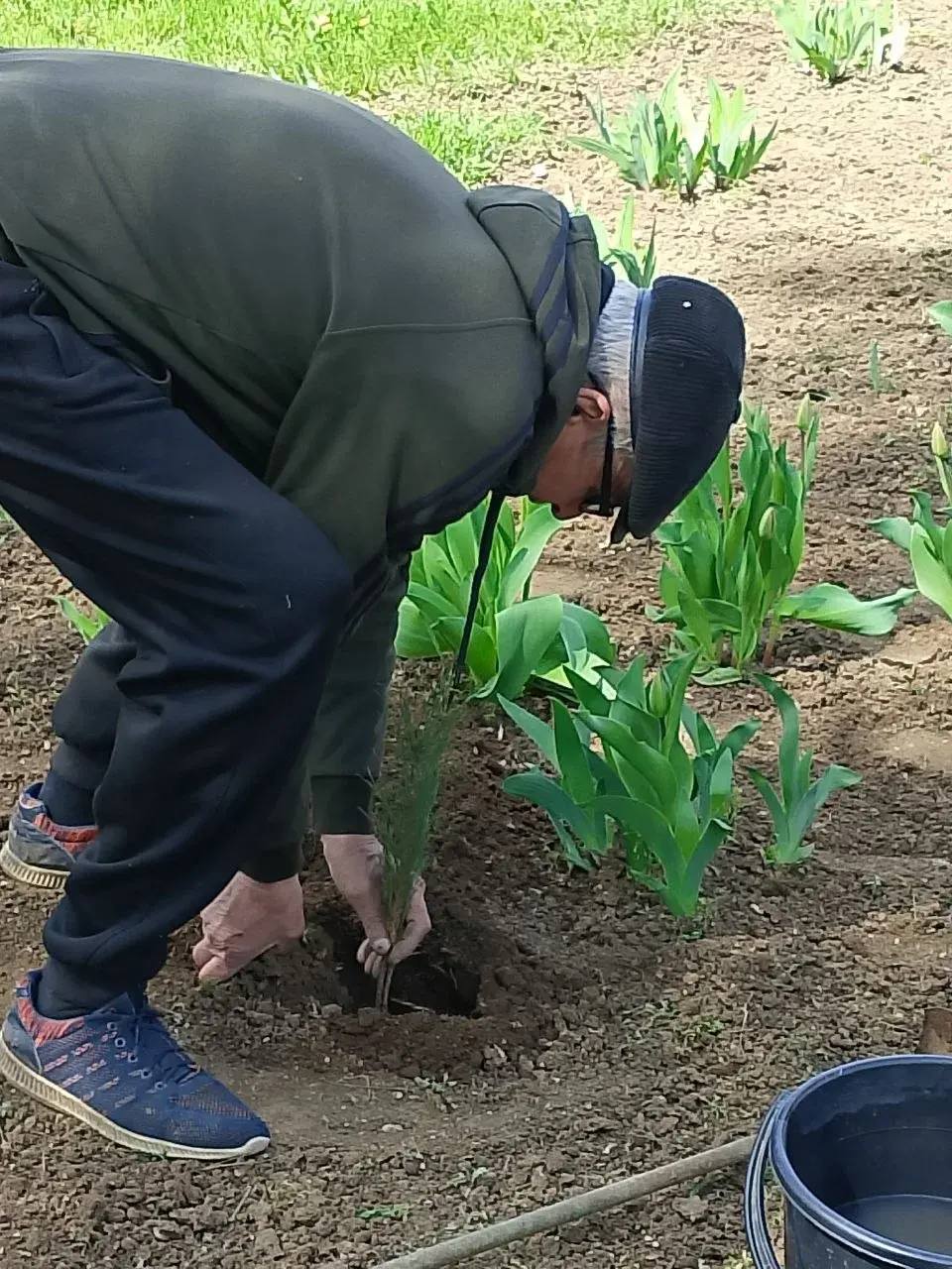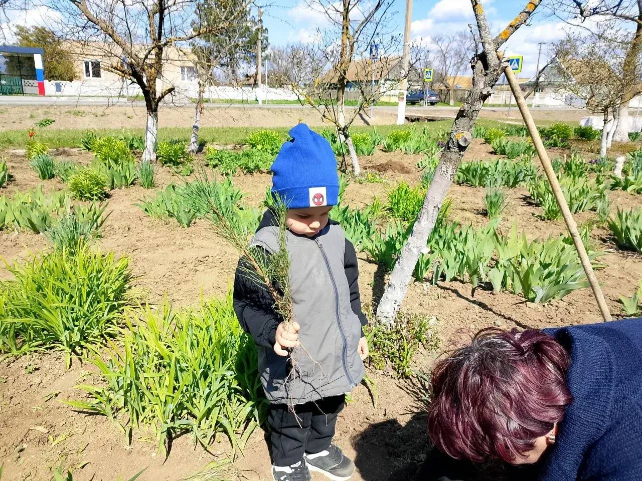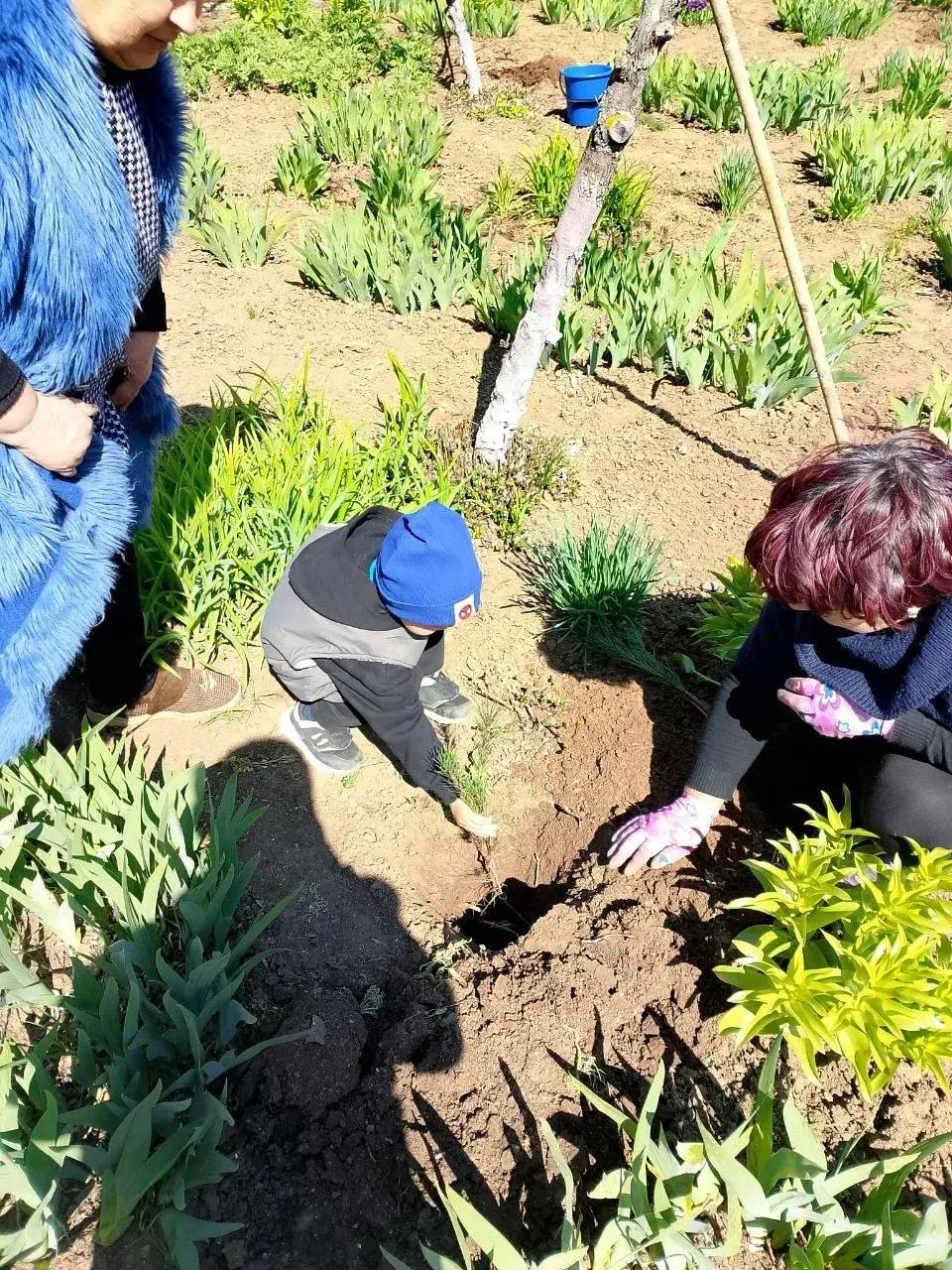 На приусадебном участке учреждения они высадили зеленые саженцы хвойных растений. Причем, к труду привлекли всех - и старшее поколение, и детишек.