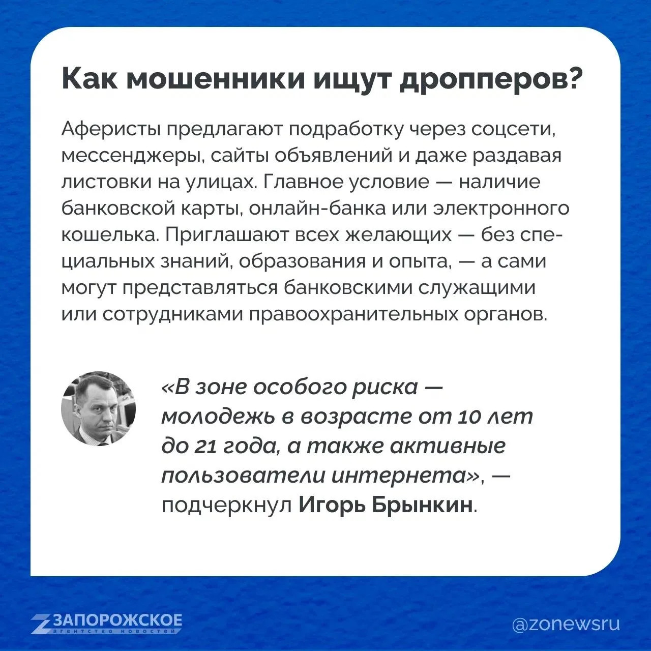 Как не стать «живым щитом» для злоумышленников и что грозит пособникам — объясняем вместе с заместителем управляющего Отделением по ЛНР Южного главного управления Банка России Игорем Брынкиным.