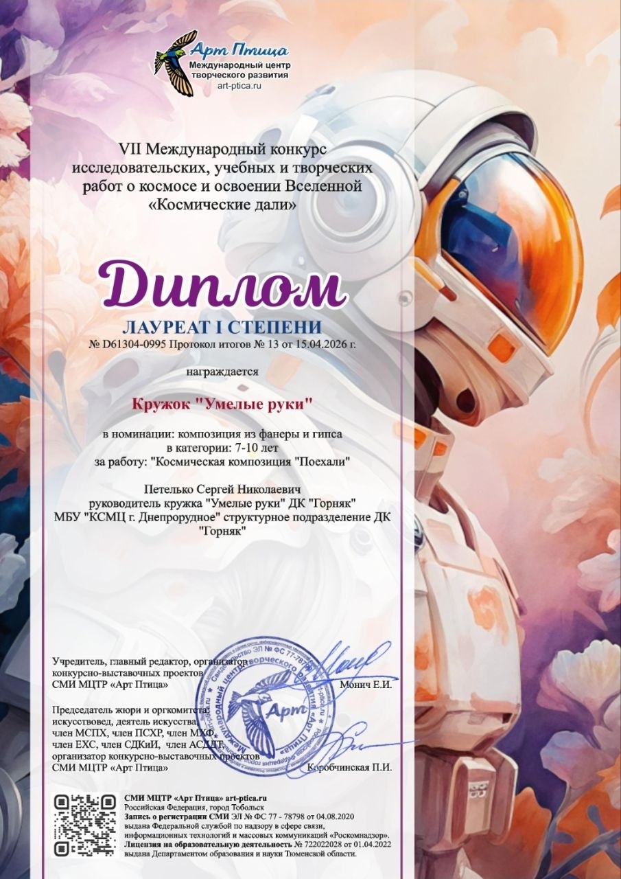 Космическая композиция "Поехали", созданная совместными усилиями кружка "Умелые руки" и кружка прикладного и декоративного творчества "Лисёнки", удостоилась диплома лауреата 1 степени!