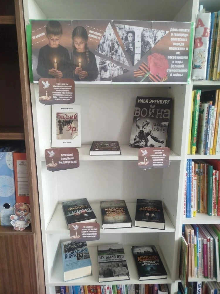 В Акимовской центральной библиотеке оформлена книжная выставка "Геноцид советского народа" и проведен обзор литературы, связанный с этим событием. Представленные на выставке книги - это свидетельства того, как нацистский режим не только осуществлял прямые массовые убийства, но и проводил бесчеловечные эксперименты в контрационных лагерях. Выставки оформлены в Атманайской, Чернозёмненской, Петровской библиотеках.