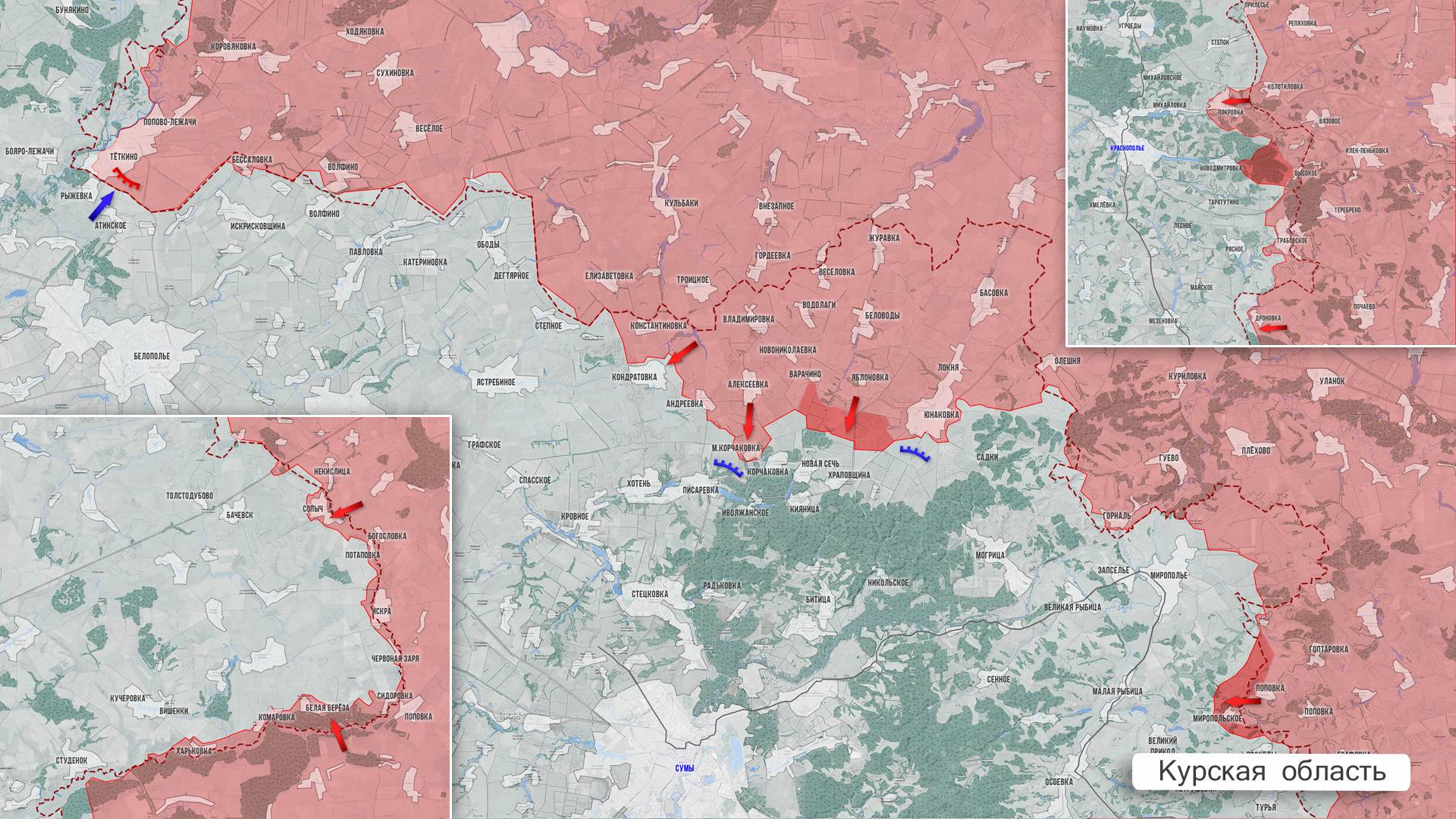 В Сумском приграничье ВС РФ продвинулись на 200 м на Глуховском участке, на 500 – на центральном плацдарме в районе Мирополья, а также на 400 м – на Краснопольском участке, где идут бои за Таратутино. Контроль над ним позволит давить на Новодмитровку не только с востока, где наши зачищают Великий лес, но с юга, забрав прилегающие леса.