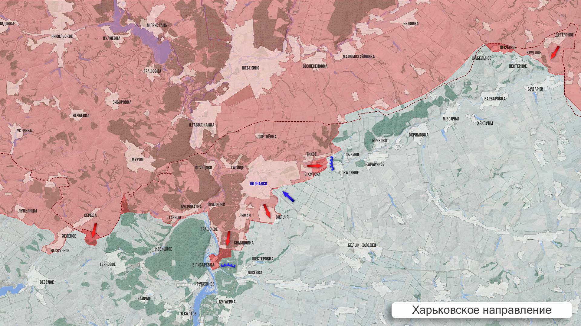 На Харьковском направлении ВС РФ развивают наступление к Бугаевке и Лосевке, а также на севре от Шестеровки. Складывается критическая для ВСУ ситуация на участке от Покаляного до Охримовки. Форсировав реку, наши бойцы потеснили противника в Охримовке и вышли к южной окраине села и дороге Волчанск – Землянки. Чтобы не дать ВС РФ спуститься на юг вдоль р. Плотва и выйти в тыл группировки ВСУ в Ольховатке, противник ожесточённо контрактует со стороны Захаровки. В свою очередь наши накатывают на Ольховатку с востока из района Шевяковка-Чугуновка.