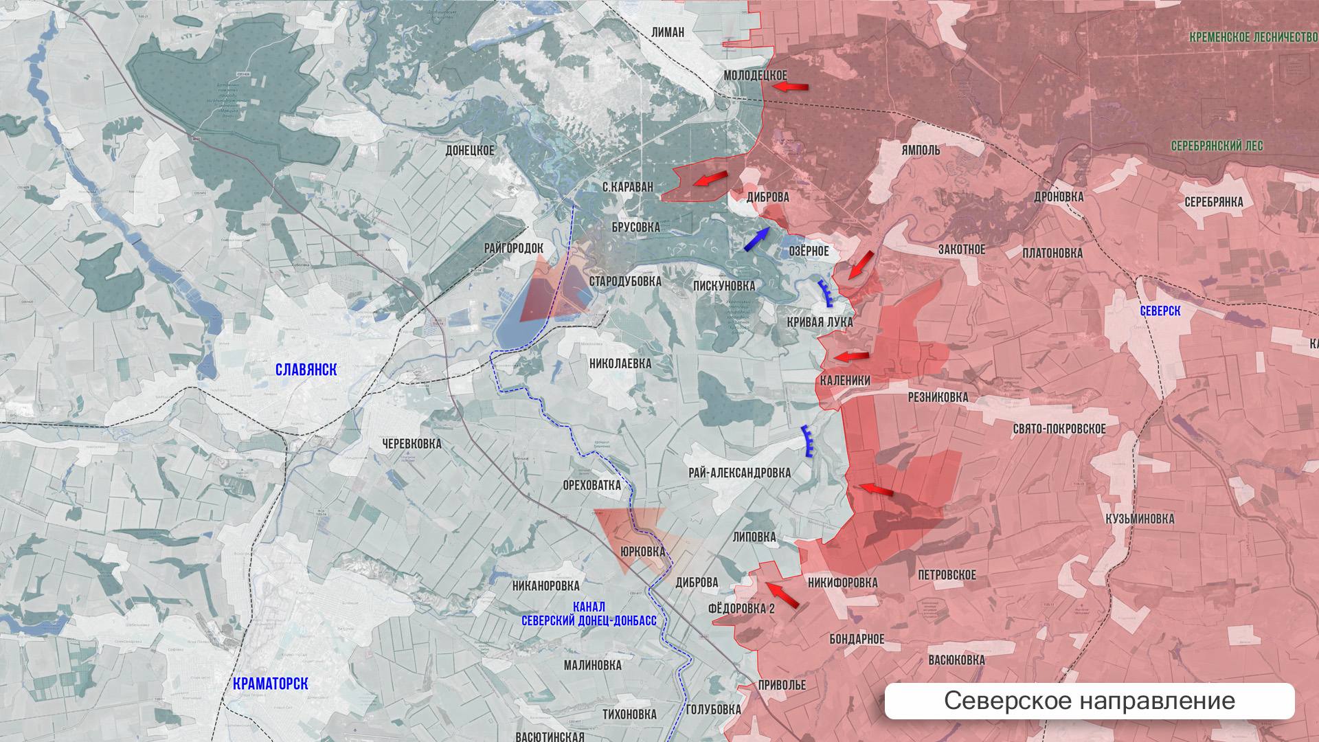На юго-востоке Красного Лимана ВС РФ сражаются за Масляковку и пытаются вновь зайти в город. На севере города, в районе фермы и ул. Подстепной и Цимлянской, закрепиться нашим пока не удаётся. На юге от Ставков «качели»: ВС РФ уступили урочища на юго-западе, но забрали лесополки на юго-востоке. Выше по фронту наша артиллерия и расчеты БПЛА установили контроль над участком дороги в районе Александровки. При этом на местах отмечают примерно троекратное преимущество ВСУ в дронах. Сообщают, что со стороны Изюма к Осколу и Студенку прибывает много наёмников. Ранее командование ВСУ усилило пехоту противника в районе Пришиба, теперь в Яцковке, Рубцах, Лозовой.