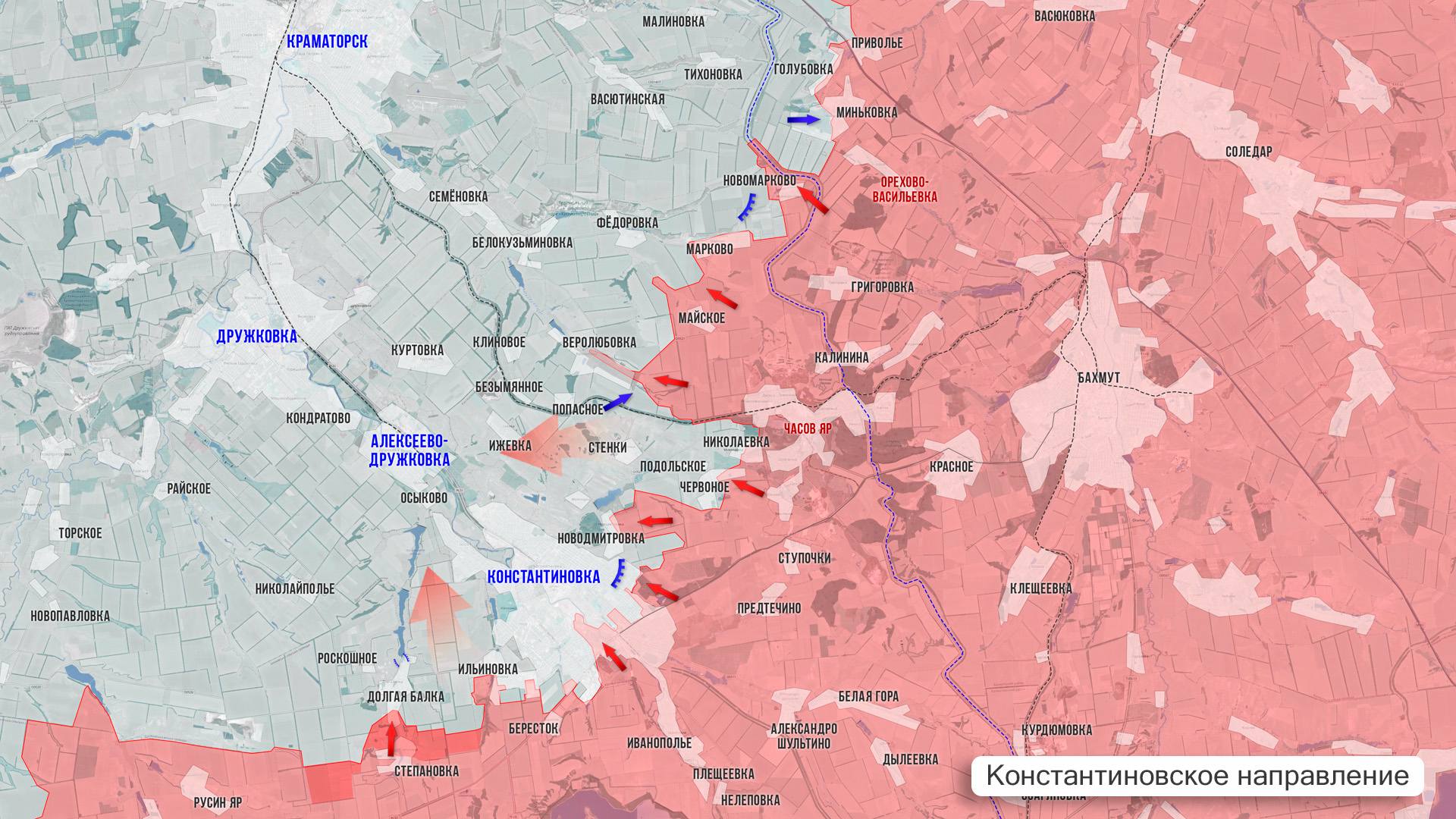 В промзоне Константиновки, в южной и юго-западной части города, –перестрелки малых групп пехоты. ВСУ активно используют сбросы с тяжёлых гексакоптеров. Приоритетной задачей наших войск становится не контроль очередного подвала, здания, а уничтожение точек запуска дронов. На северном въезде в город растет «кладбище» техники ВСУ: бронеавтомобили, пикапы и наземные роботизированные комплексы уничтожаются российскими дронами на оптоволокне. Не стихает накал боёв на флангах Константиновки: в Долгой Балке и в Ильиновке, а также на окраине Часов Яра.