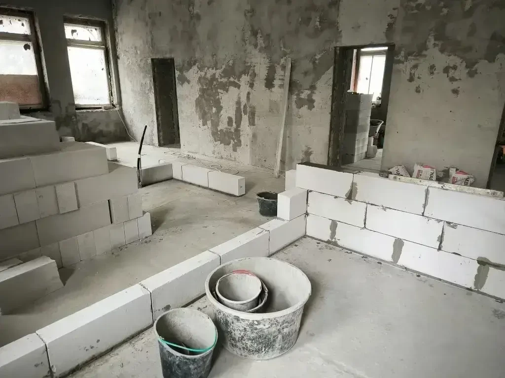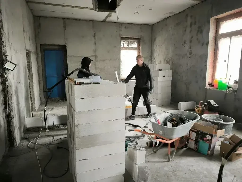 Подрядчик уже выровнял стены — это была основа для дальнейших работ. Сделана точная разметка под новые помещения. Началось возведение межкомнатных перегородок из блоков — своими глазами видно, как меняется внутренняя планировка.