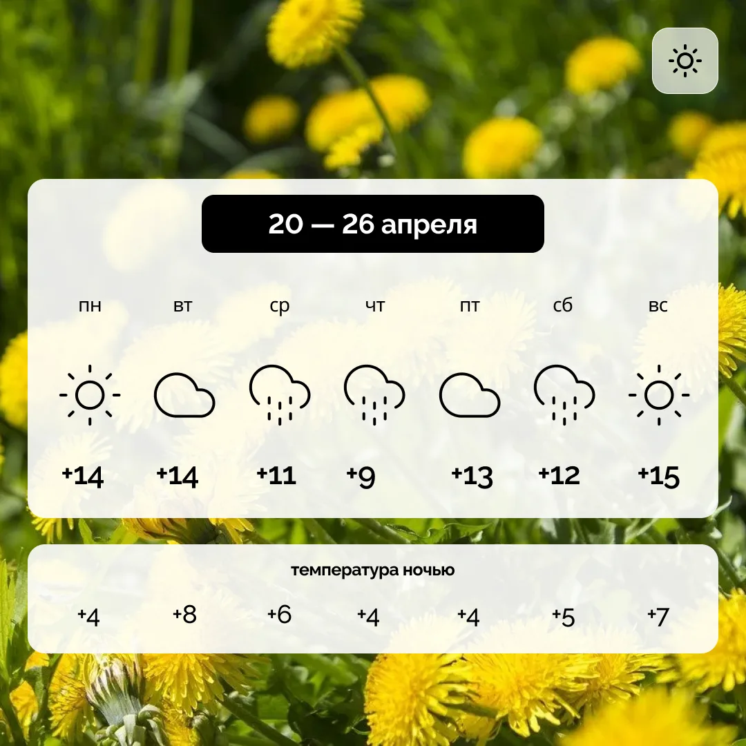 На протяжении недели температура воздуха составит +13 °C днем, а ночью температура воздуха не опустится ниже +4 °C.