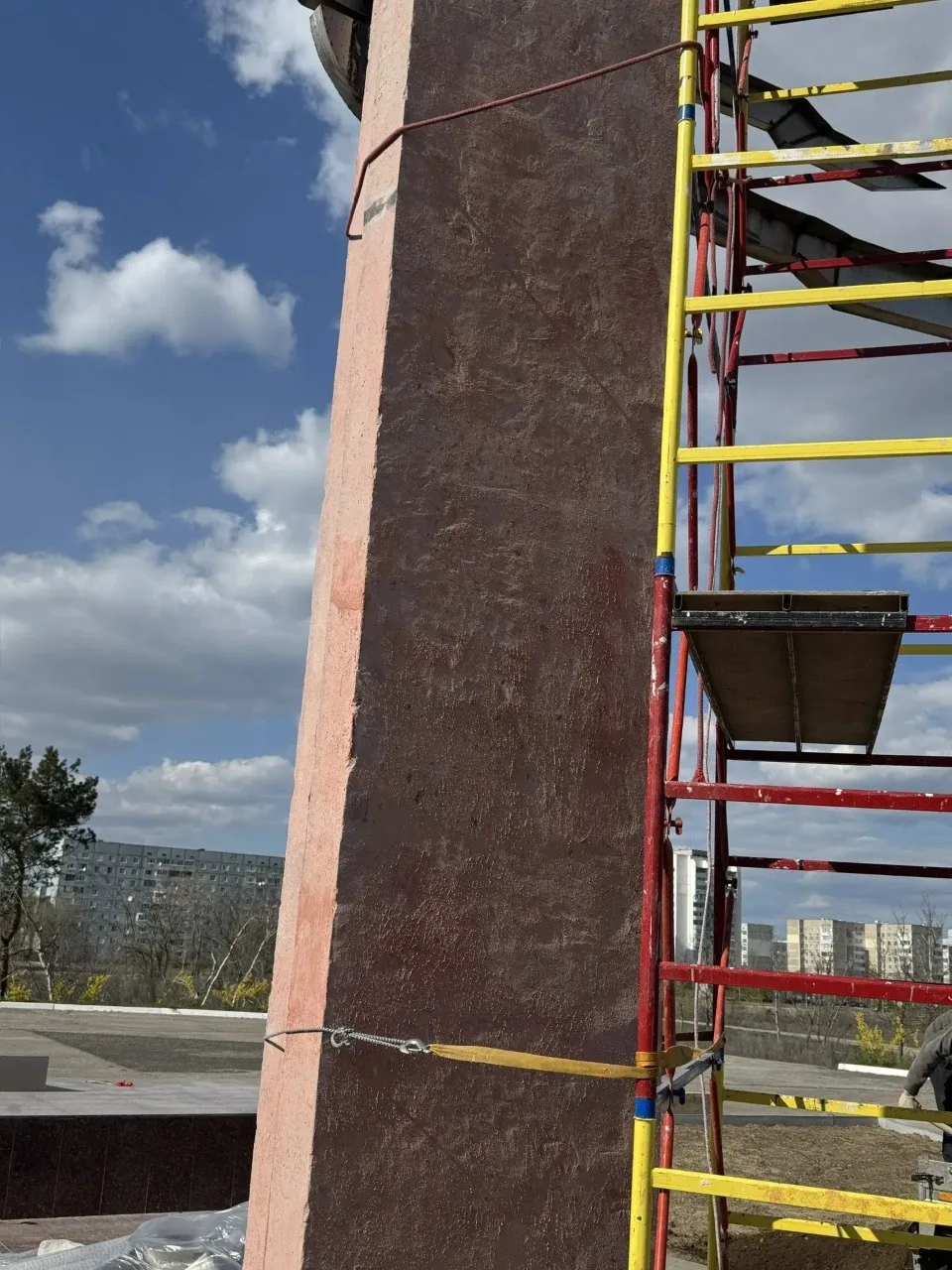 Уже завершены работы по очистке стелы от старой краски. Для этого использовали строительные леса, так как высота конструкции составляет около 9 метров. В настоящее время выполнена подготовка поверхности к дальнейшему оштукатуриванию — нанесён бетоноконтакт.