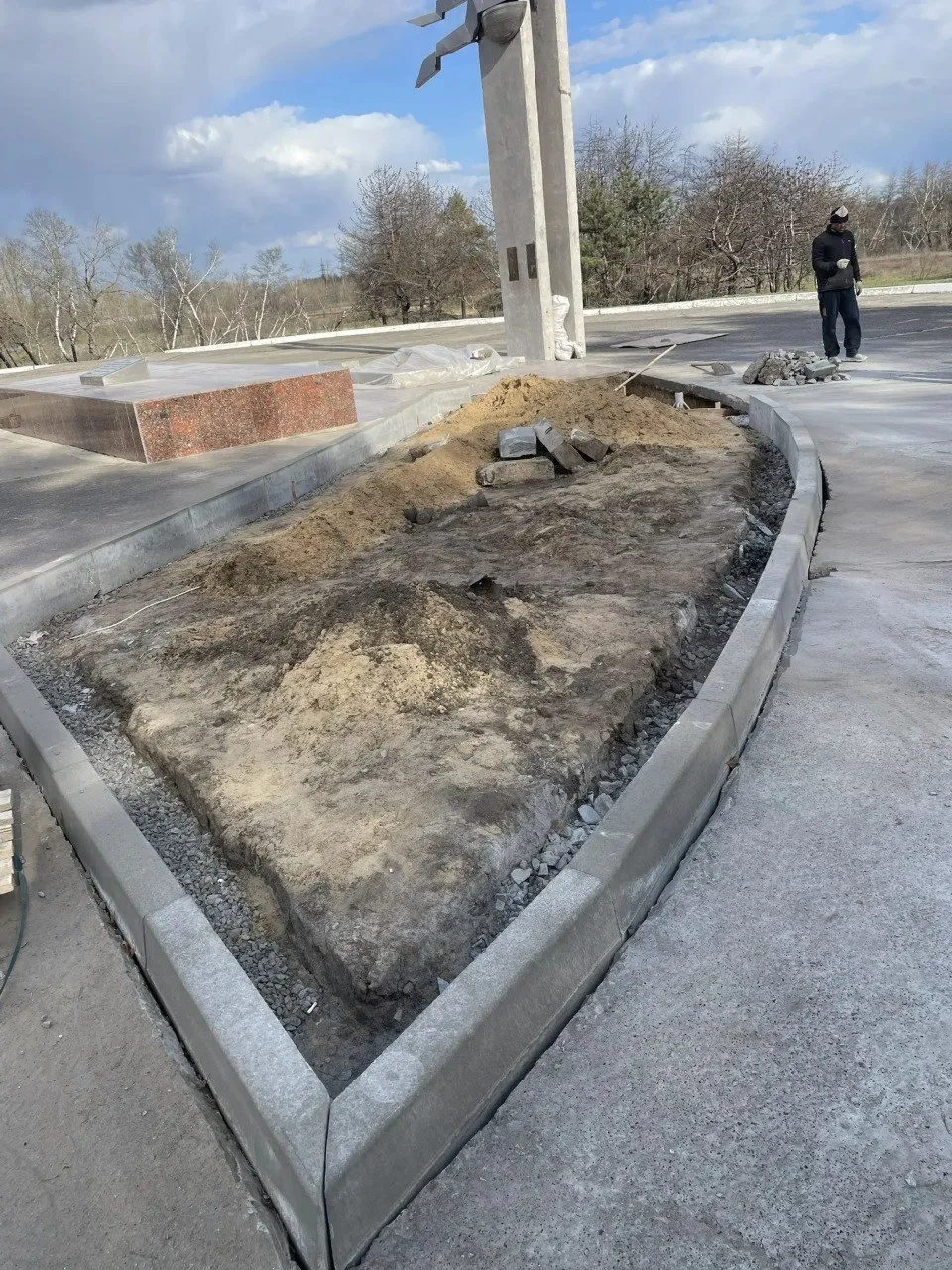 Подрядная организация продолжает работы по благоустройству памятника на братской могиле советских воинов.