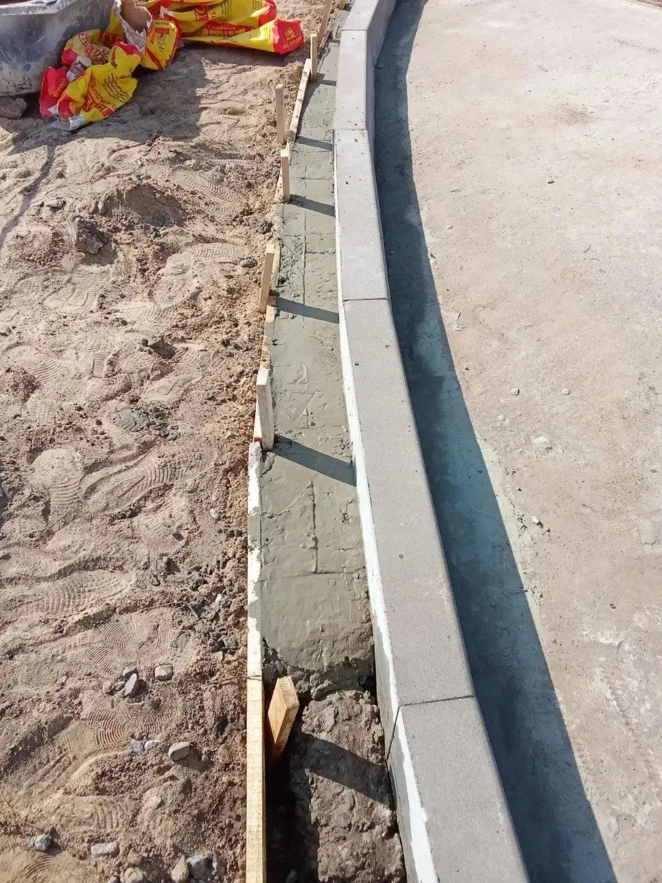 На данный момент выполнен монтаж новых бордюров на клумбах. Для их надежной фиксации специалисты установили опалубку и провели заливку цементной стяжки.