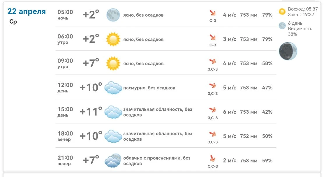 Сегодня среда, 22 апреля. Утром +2…+7°, ясно и сухо. Днём +10…+11°, пасмурно, ветер 5–6 м/с. Вечером +7…+10°, облачно с прояснениями. Без осадков весь день. Закат в 19:37.