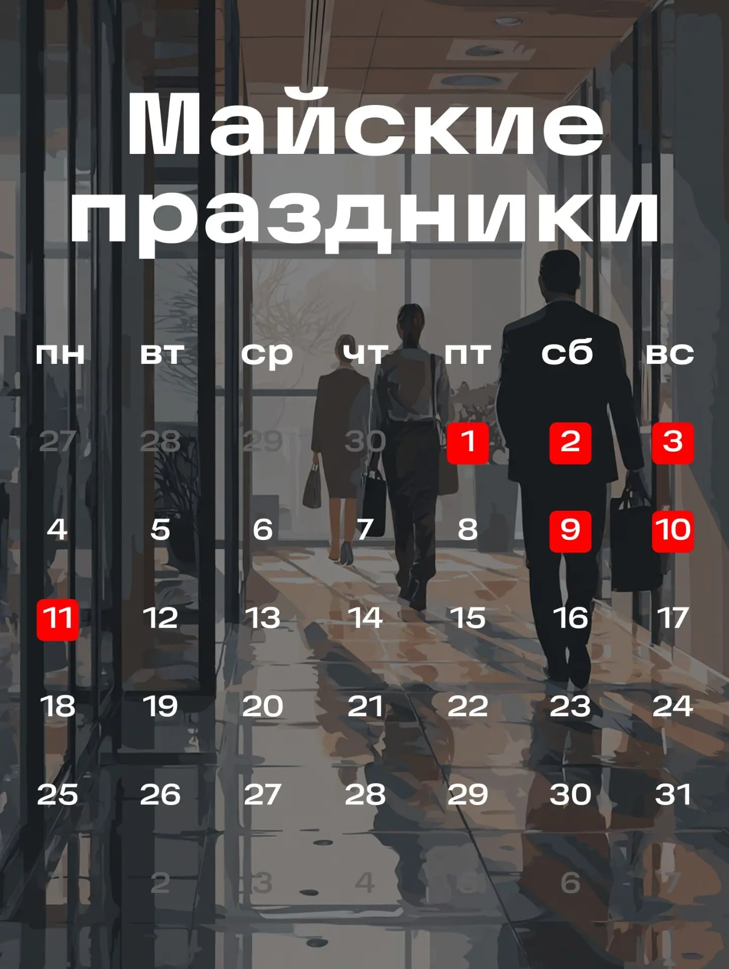 Так как первые майские дни будут праздничными, 30 апреля будет сокращенным рабочим днем, а пятница, 1 мая, - выходным.