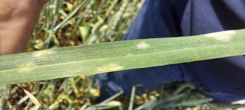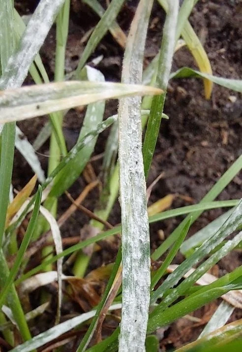 Симптомы: На листьях (реже на стеблях и колосе) появляется налёт в виде белых мучнистых подушечек – от единичных до сплошного покрытия. При длительном развитии болезни в белом налёте заметны чёрные мелкие (0,2–0,4 мм) шарики – клейстотеции.