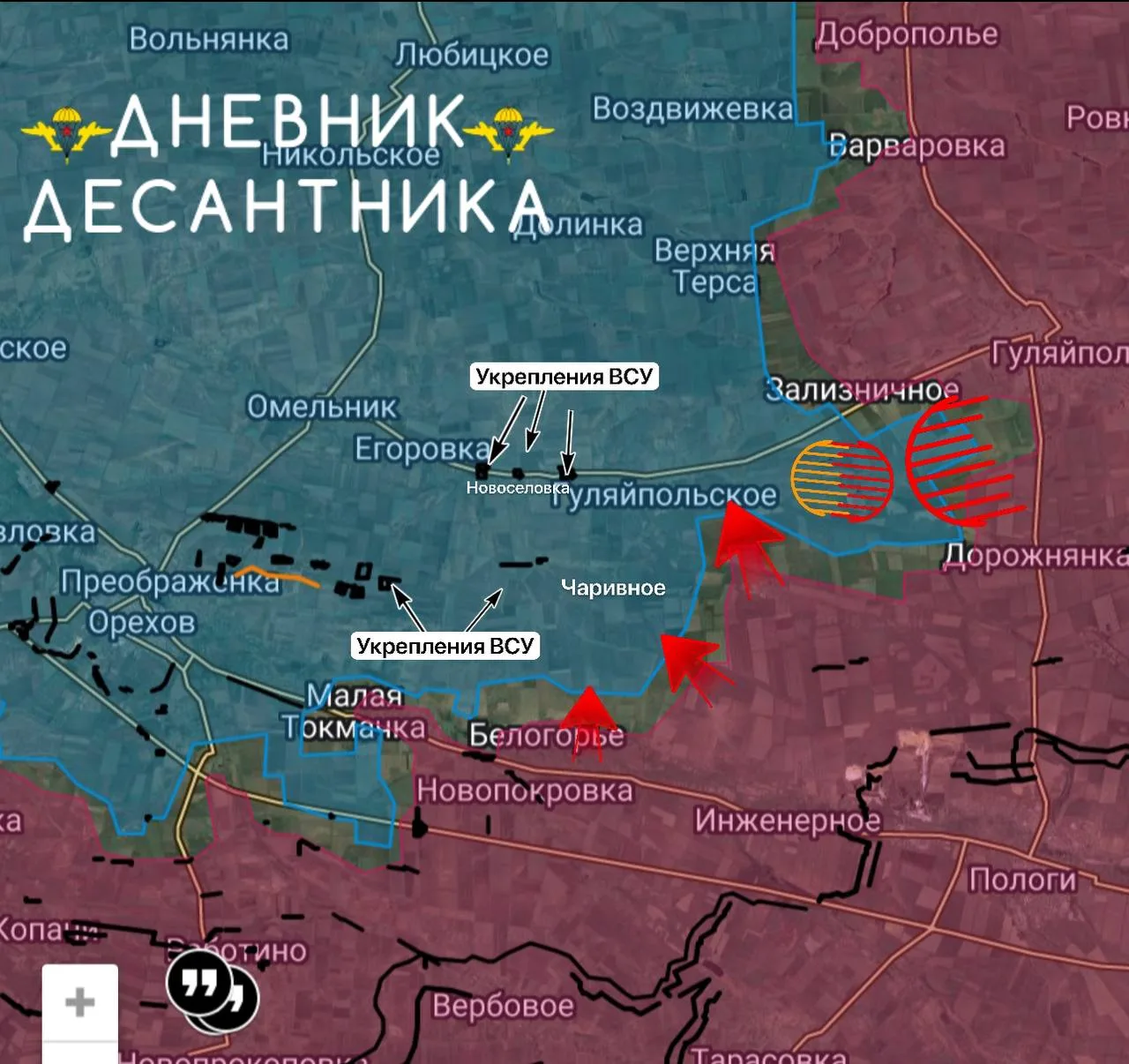 Бойцы ВС РФ берут в охват Чаривное, продвигаясь от Мирного и Белогорья, также продвигаемся к Гуляйпольскому.