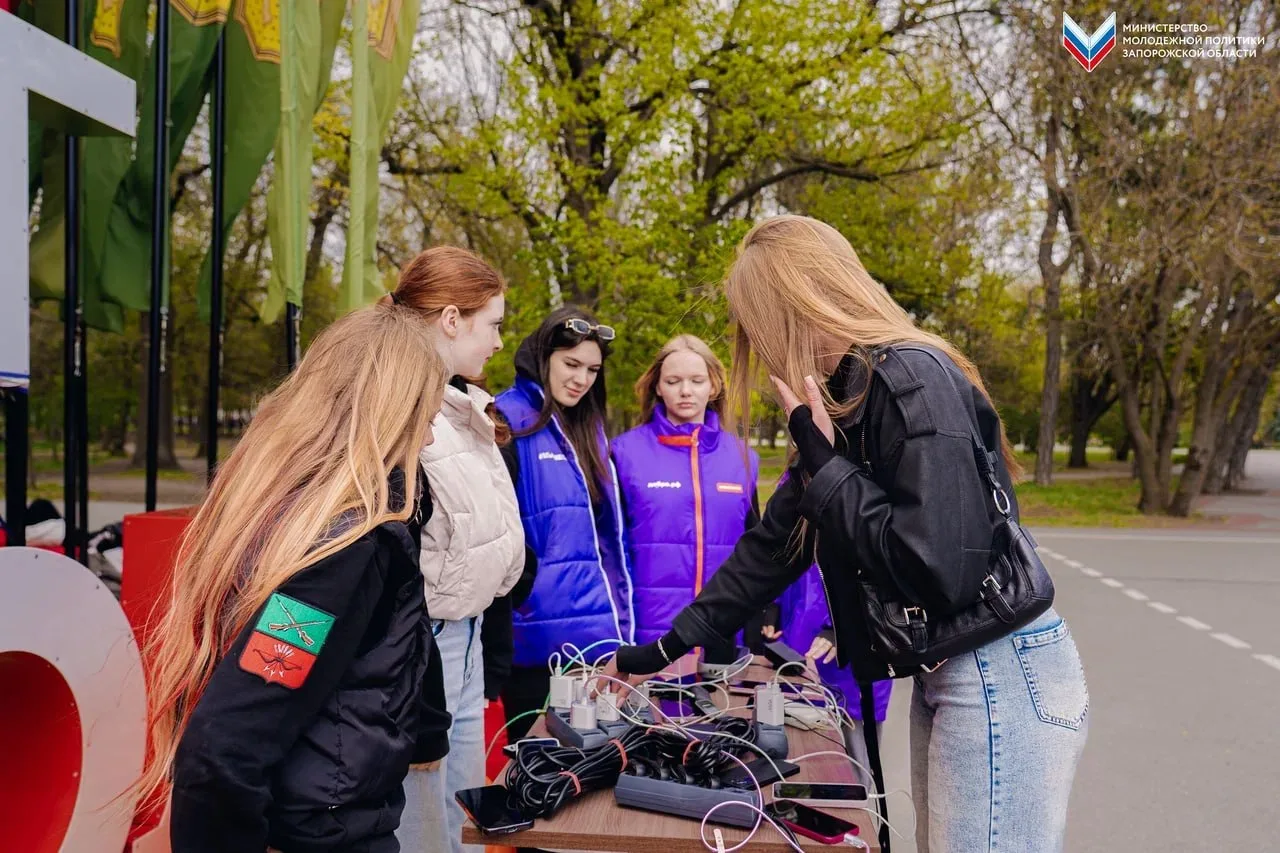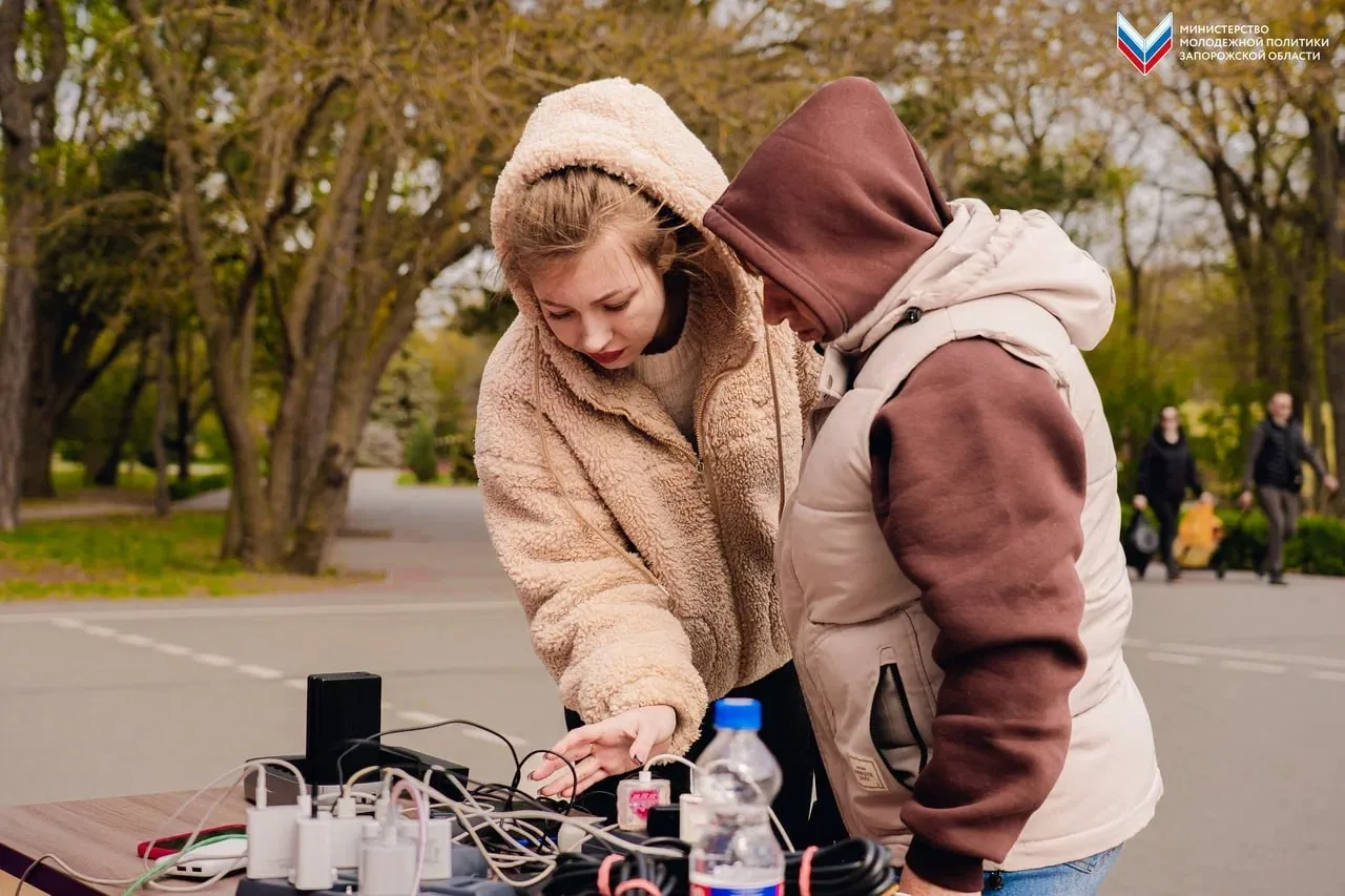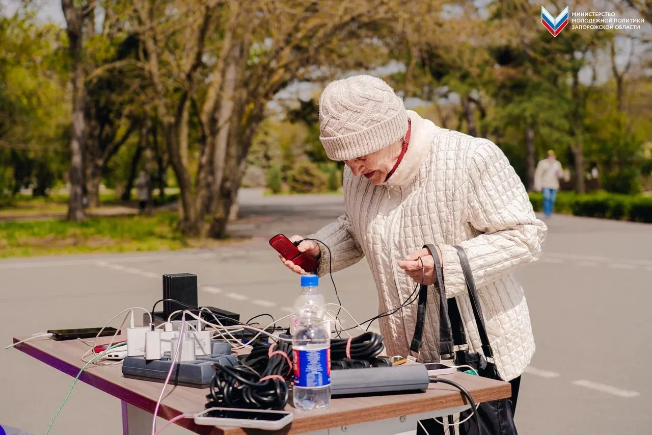 Из-за отсутствия электроэнергии в Мелитополе Министерство молодёжной политики Запорожской области совместно с «Единой Россией» развернули пункт подзарядки мобильных устройств в парке им. Горького.