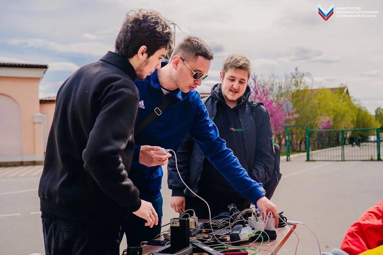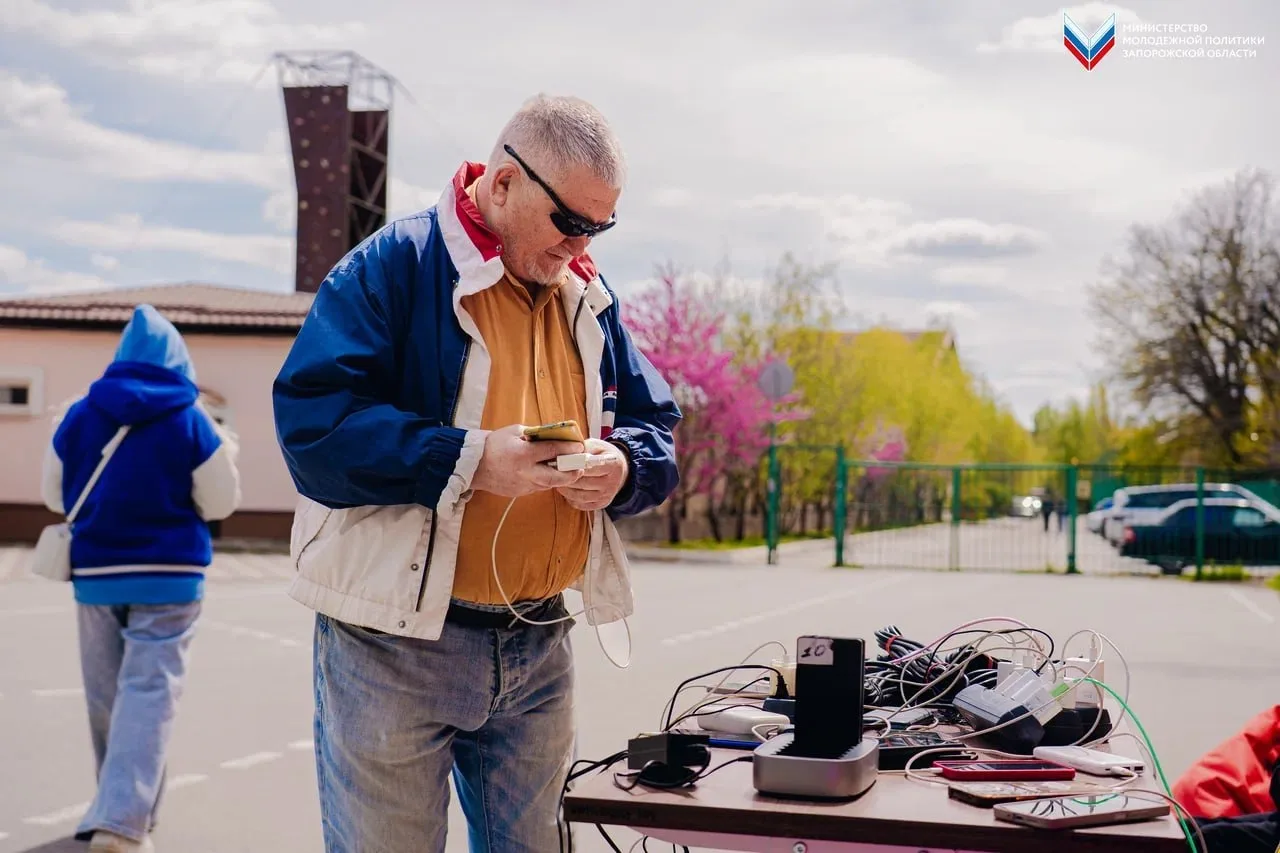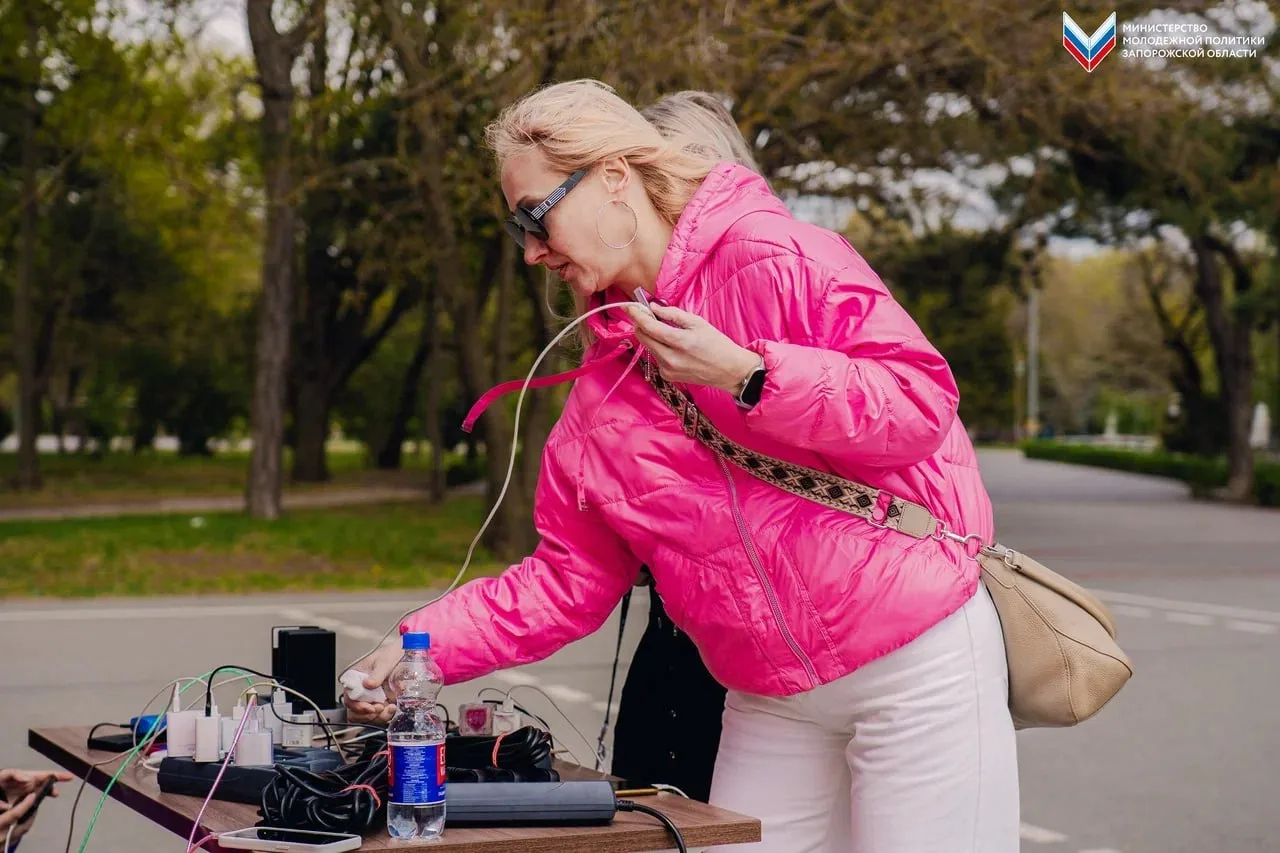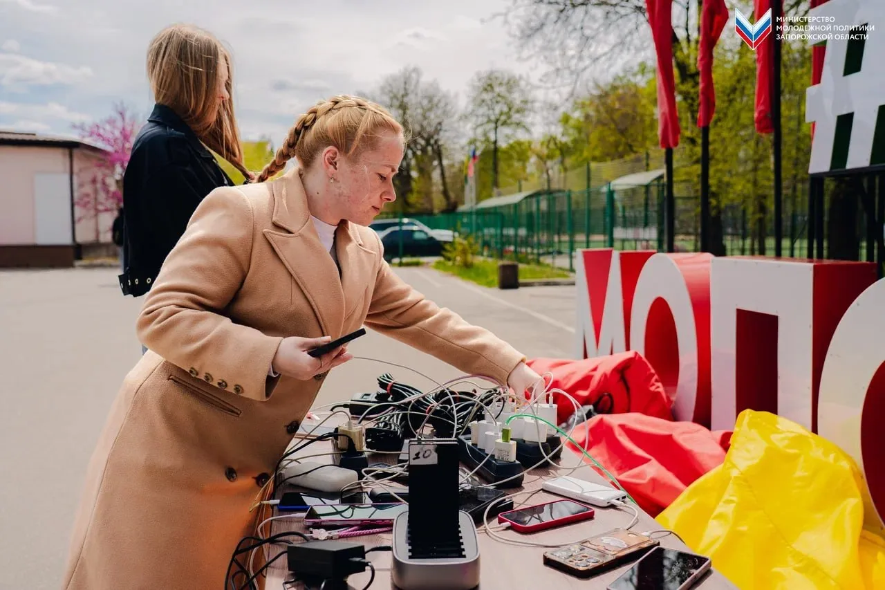Из-за отсутствия электроэнергии в Мелитополе Министерство молодёжной политики Запорожской области совместно с «Единой Россией» развернули пункт подзарядки мобильных устройств в парке им. Горького.