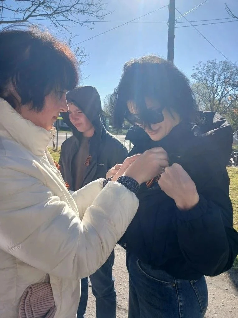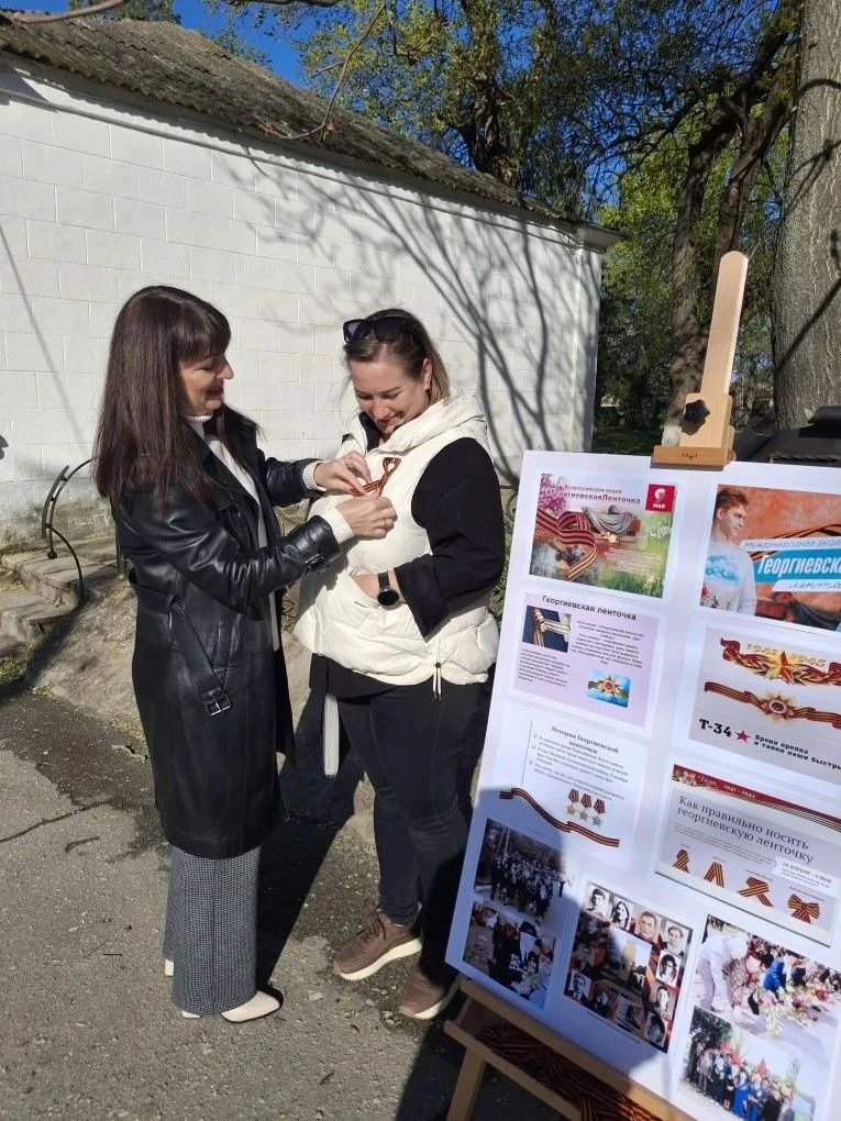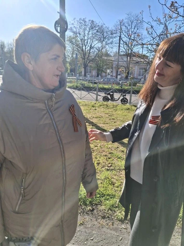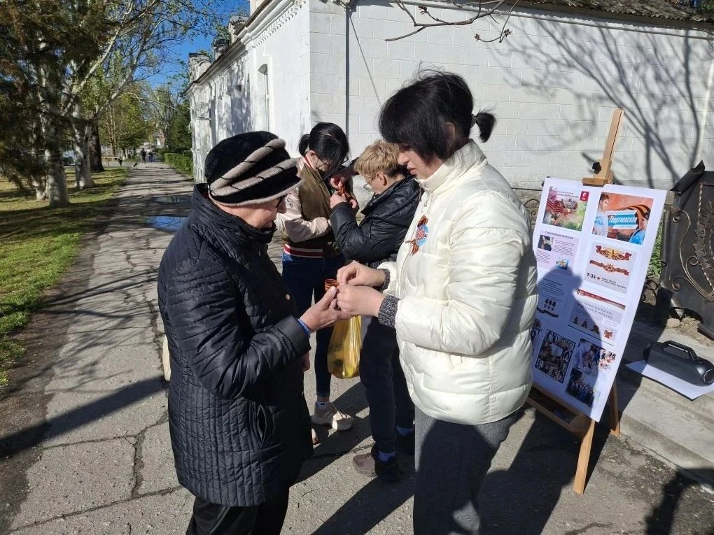 В Акимовском округе у историко-краеведческого музея сегодня символ Победы раздавали всем желающим.