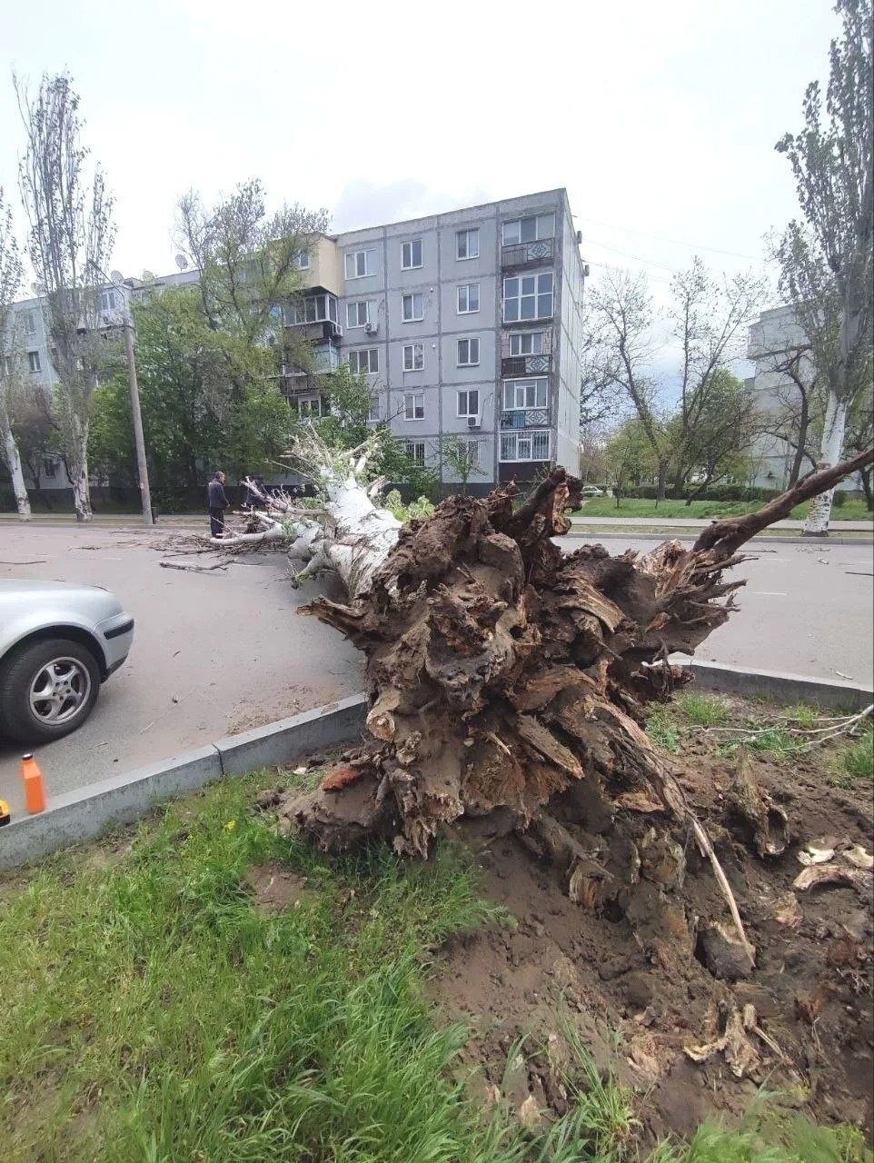 Также ветер повалил дерево на улице Комсомольской в Энергодаре. Упавшее дерево повредило проезжавшую машину и перекрыло движение.