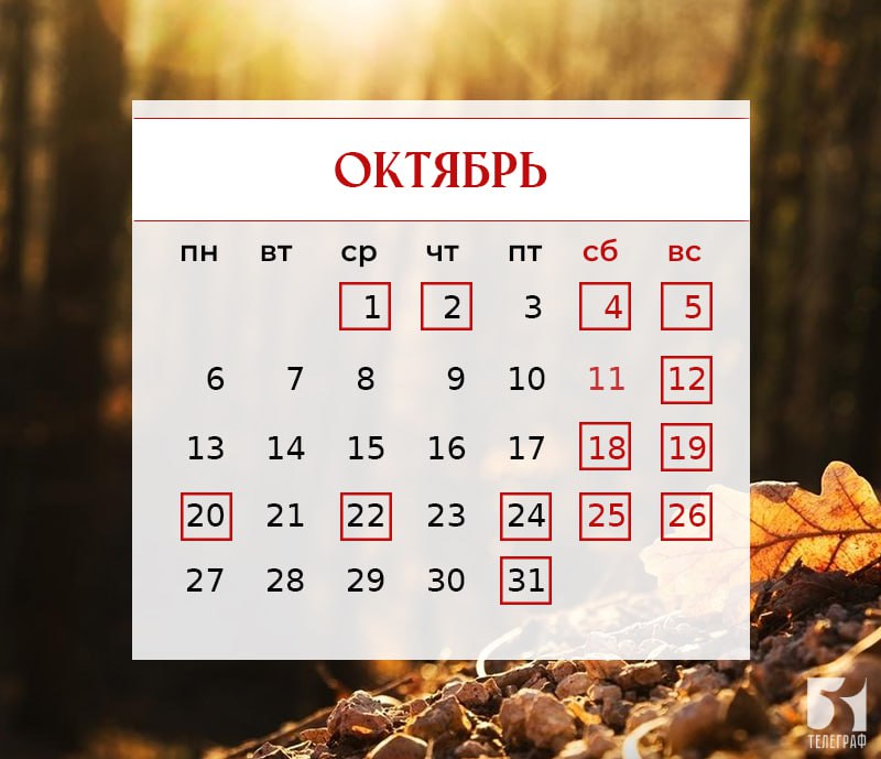 Государственных праздников и дополнительных выходных в октябре нет, поэтому работаем и отдыхаем по привычному графику.