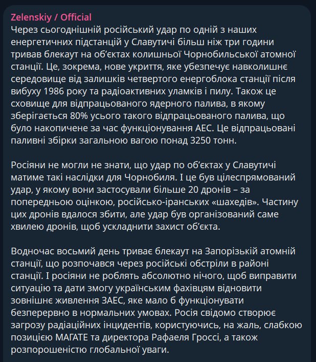 «Из-за сегодняшнего российского удара по одной из наших энергетических подстанций в Славутиче более трех часов продолжался блэкаут на объектах бывшей Чернобыльской атомной станции».