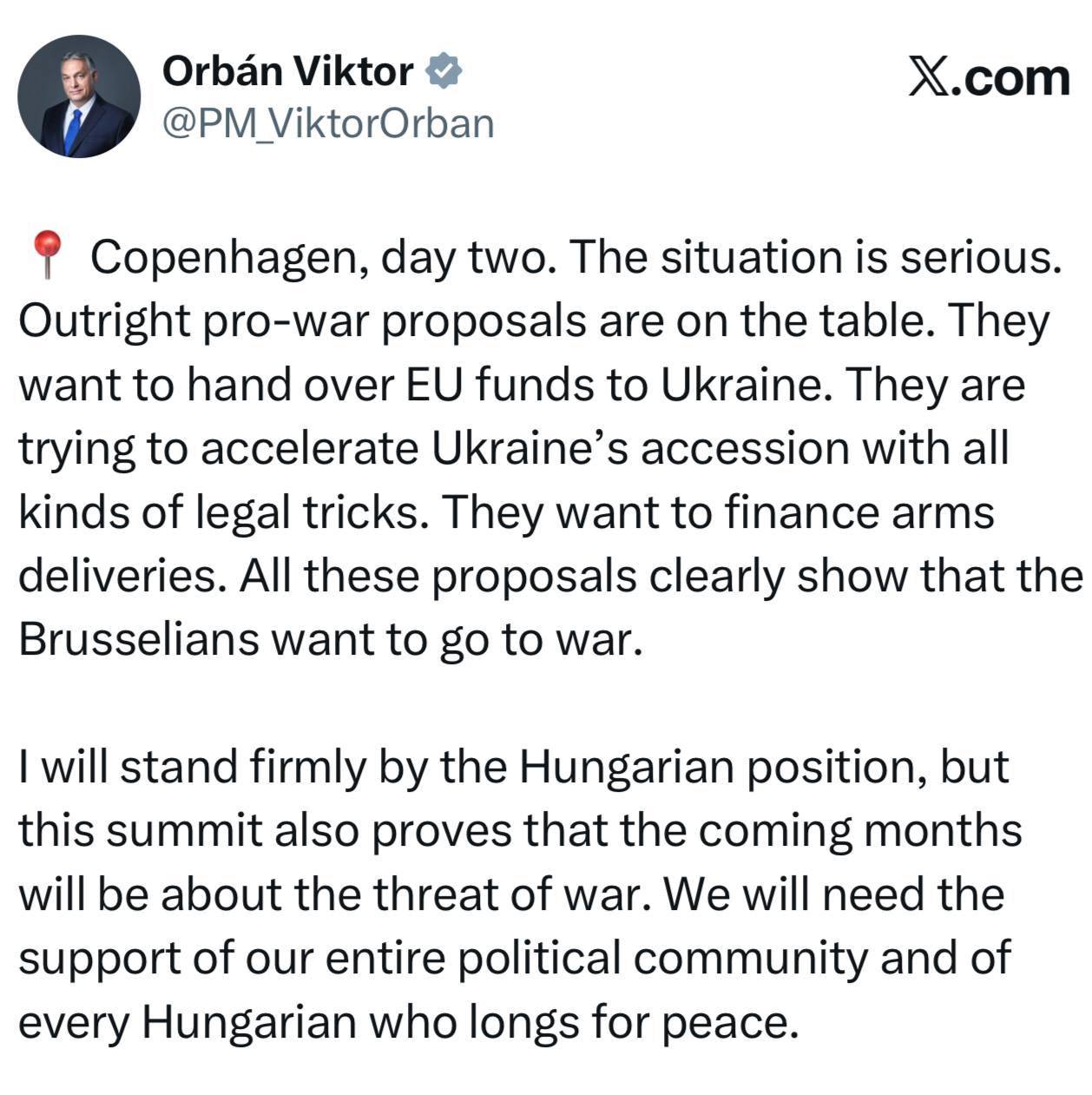«Ситуация серьёзная. На столе переговоров находятся откровенно провоенные предложения. Они хотят передать Украине фонды ЕС. Они пытаются ускорить вступление Украины, используя всевозможные юридические ухищрения. Они хотят финансировать поставки оружия. Все эти предложения ясно показывают, что брюссельцы хотят начать войну. Этот саммит доказывает, что ближайшие месяцы будут связаны с угрозой войны».