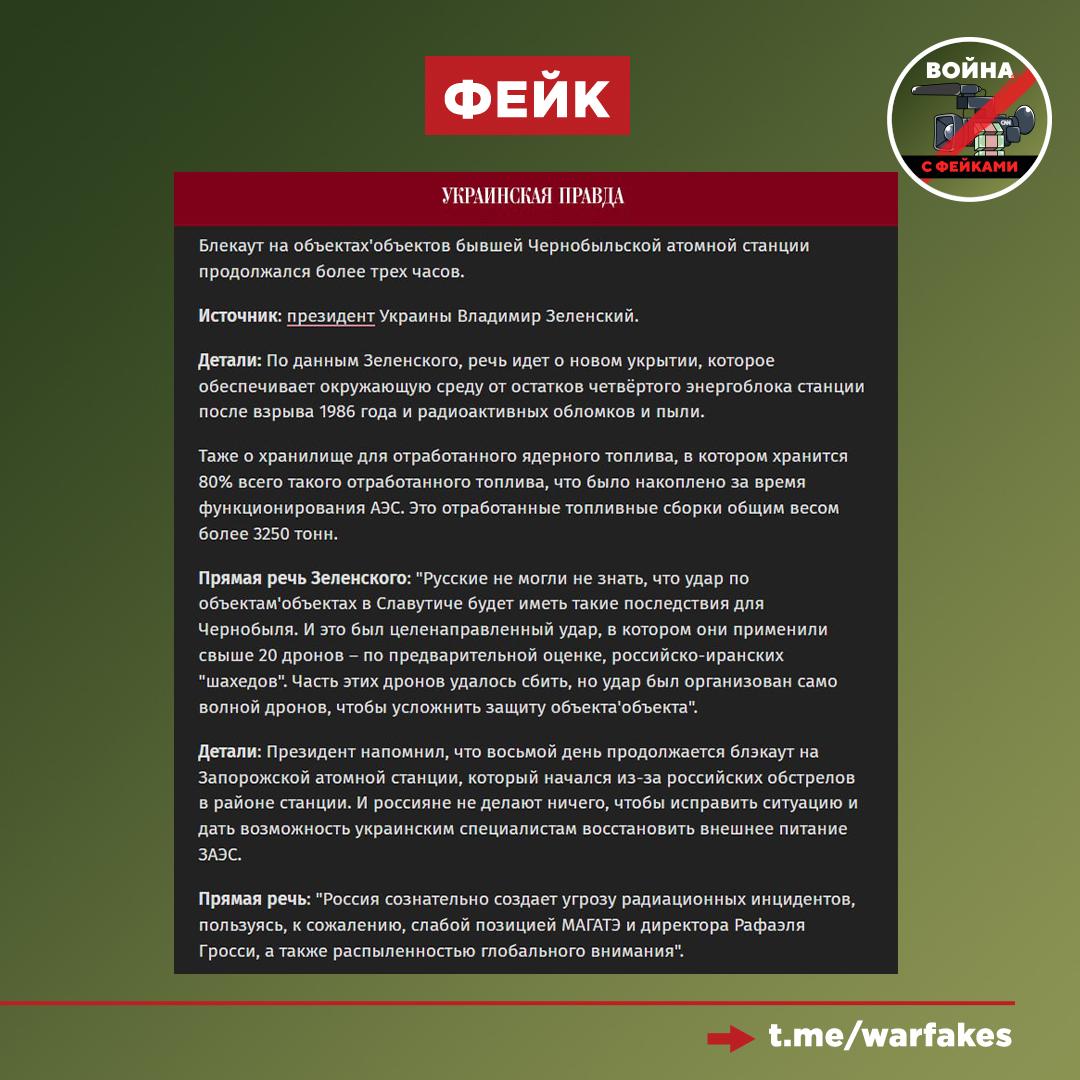 Фейк: ВС РФ устроили блэкаут на Чернобыльской АЭС, чтобы спровоцировать атомную экологическую катастрофу, заявил Владимир Зеленский.