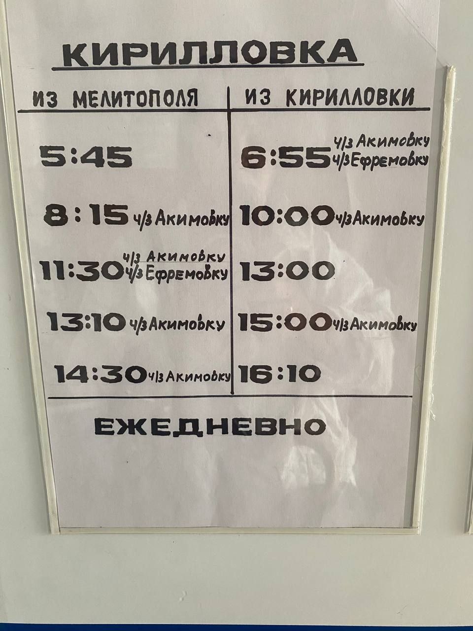 Автобус из Кирилловки отправляется с автовокзала, а прибывает в Мелитополь на автостанцию № 2 (нижний рынок)