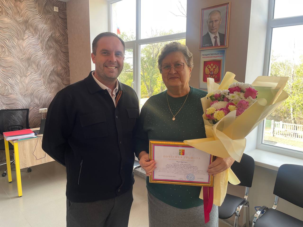Глава Токмакского муниципального округа, секретарь местного отделения партии «Единая Россия» Александр Калмыков вручил Любови Ельфимовой Почетную грамоту ко Дню учителя и подарил изысканный букет к юбилейному дню рождения.